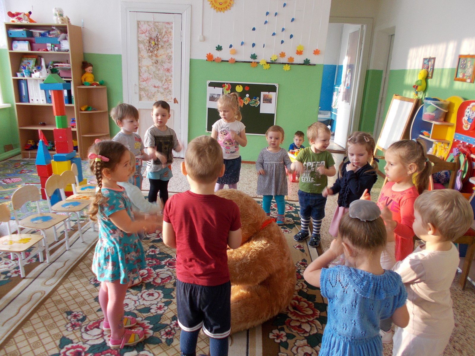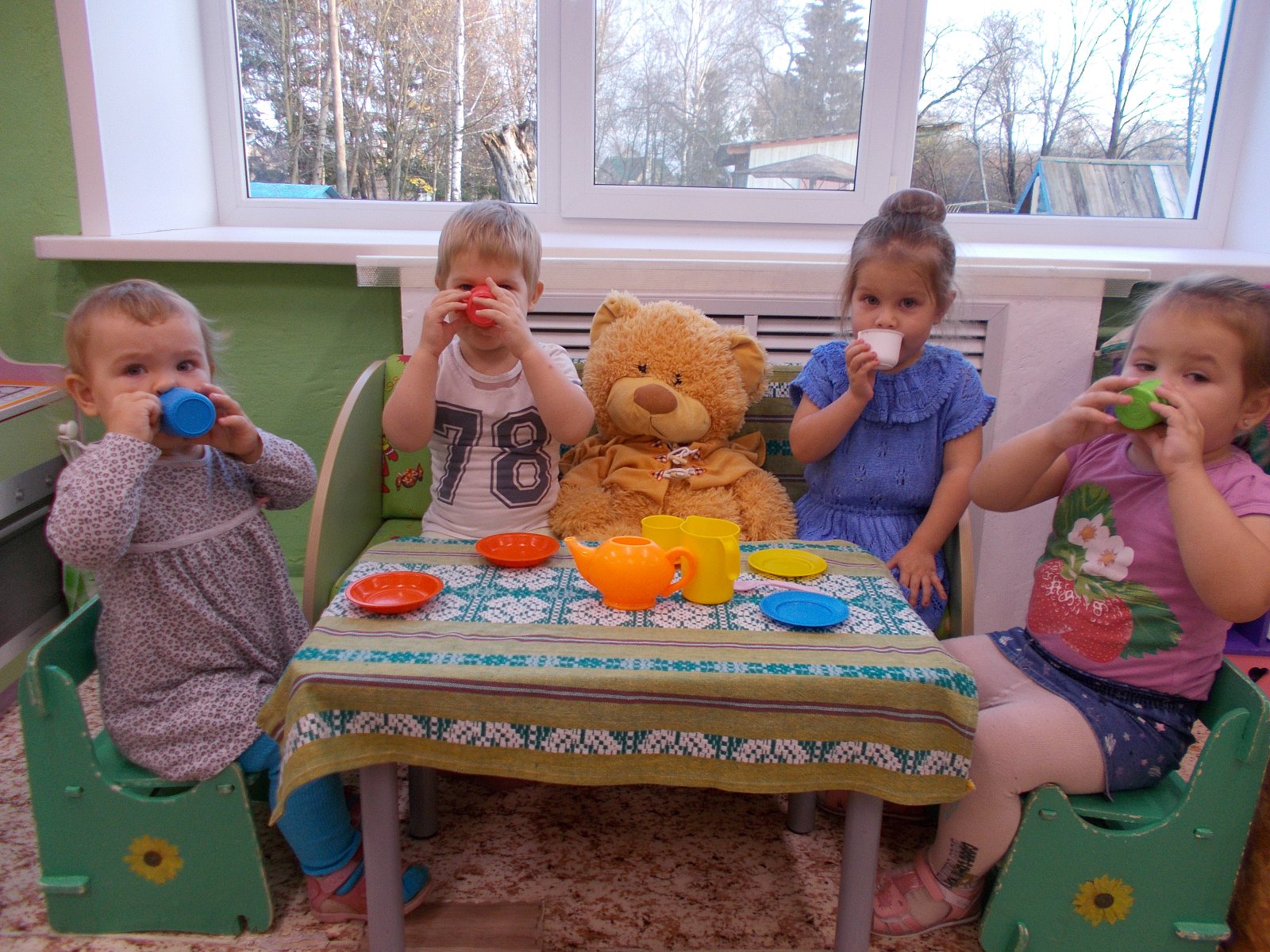 В гости к детям пришел Мишка, с ним водили хоровод , пели колыбельную песню, поиграли в подвижные игры «У медведя во бору», «Догони нас мишка», угостили мишку чаем, состязались с ними в увлекательных играх и эстафетах. Малыши нарисовали для любимой игрушки красивые пузыри и шарики. Угощали мишку печеньем и баранками, сделанными из пластилина.