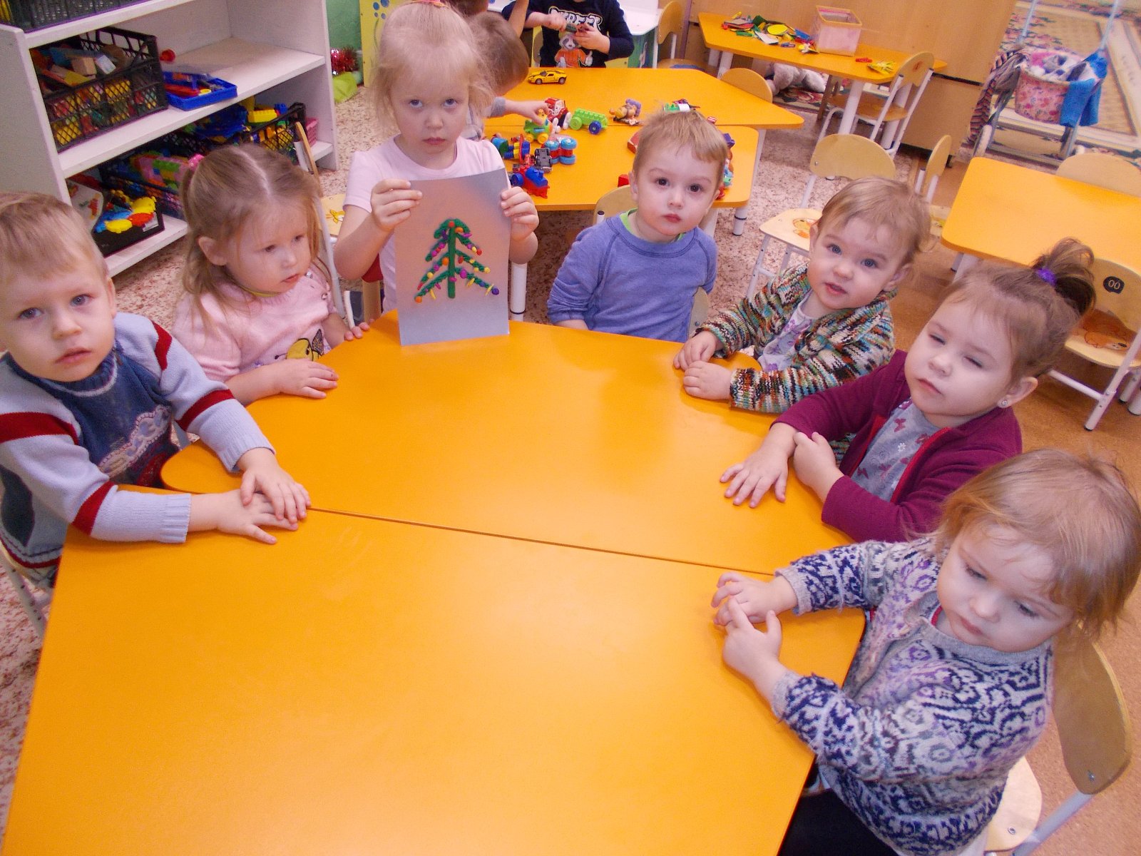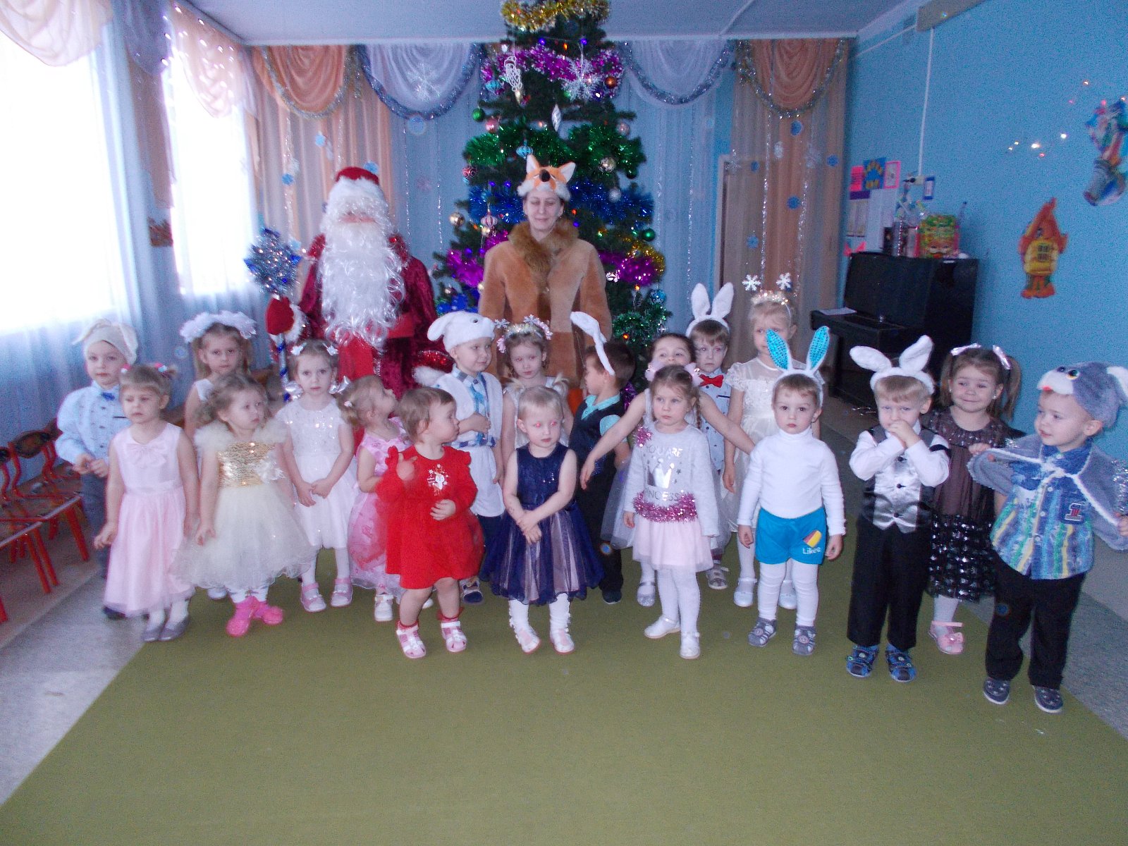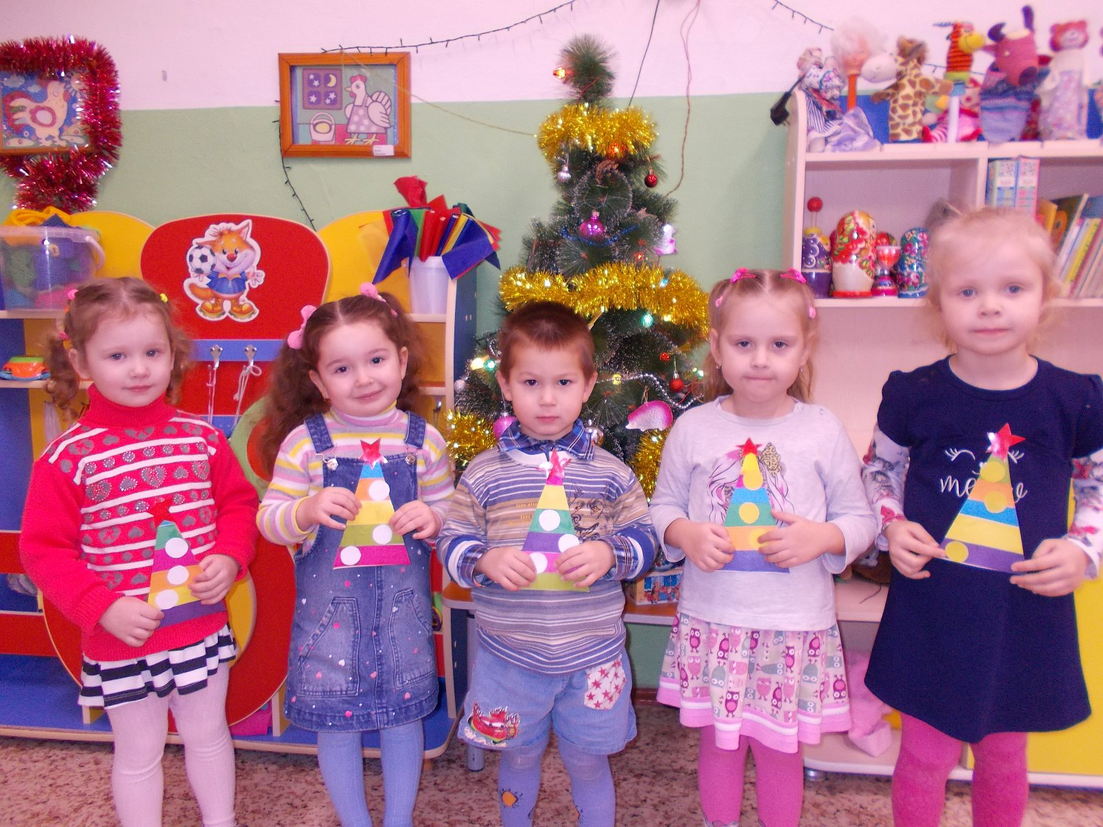 Подготовка началась задолго до наступления праздников. Воспитатель с детьми разучивали стихотворения, проводили беседы на тему Нового года, новогодних традиций, разучивали с воспитанниками песни, танцы, новогодние хороводы. Огромную работу провели по оформлению групп и музыкального зала. Дед Мороз принес в группу детям елочку. Дети младшей группы рисовали елочку и делали аппликацию «Нарядная елка»