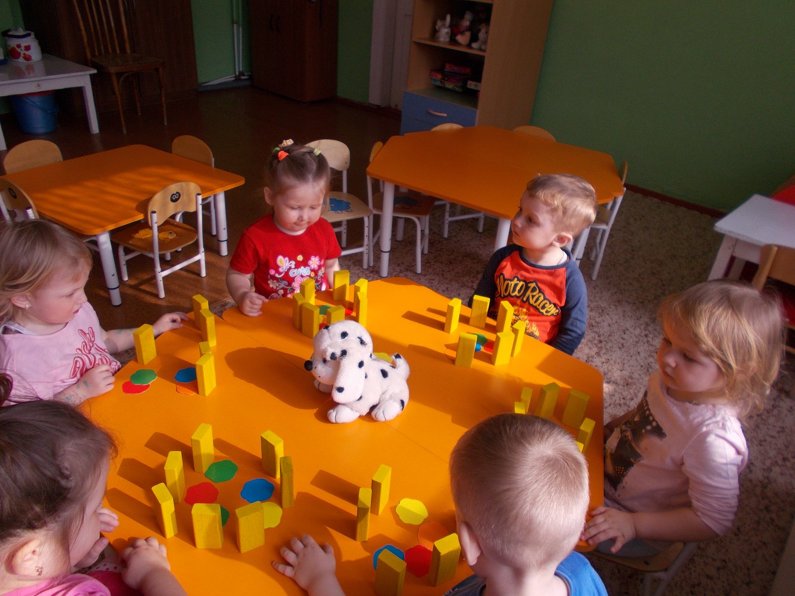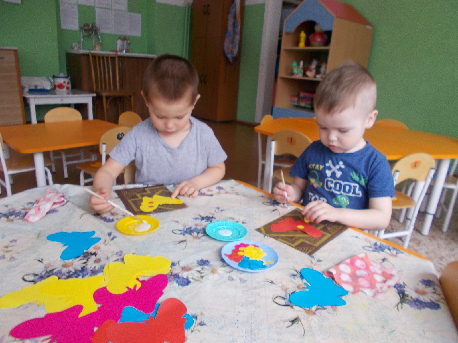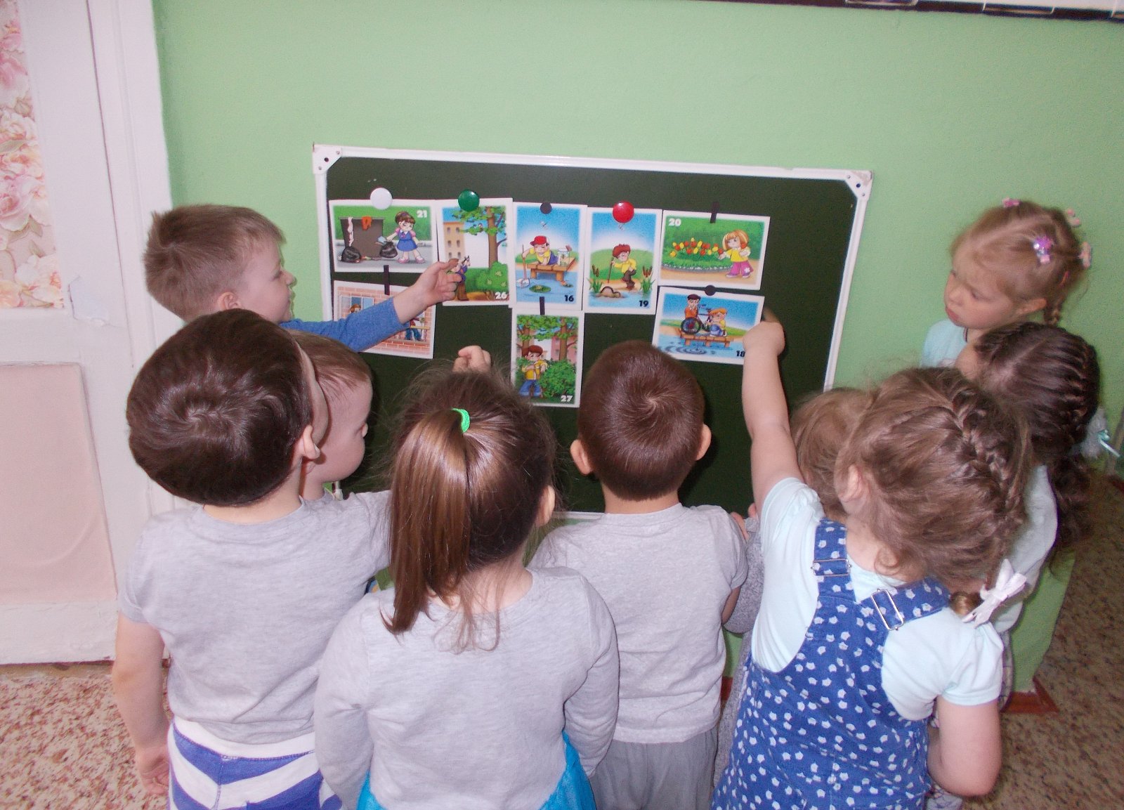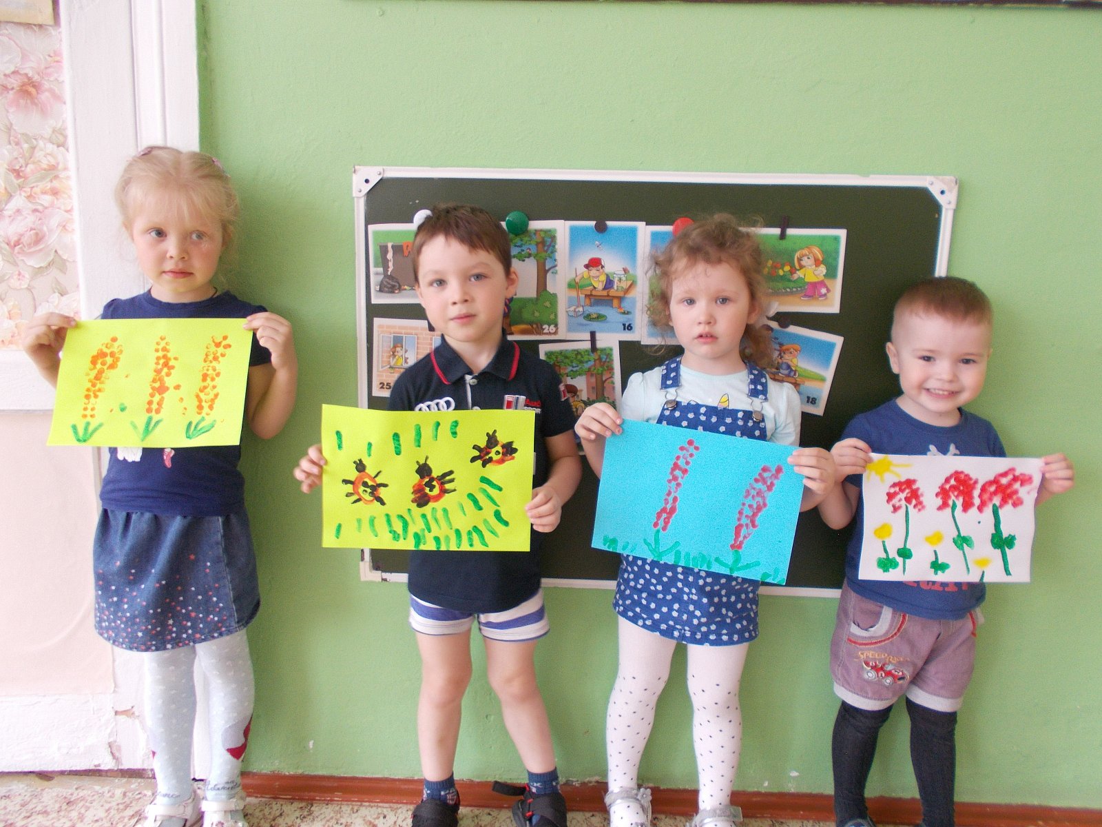С детьми были проведены занятия: «Прогулка по весеннему лесу», беседа «Береги живое». Ребята 2 группы раннего возраста конструировали «Заборчик для цветов». Дети младшей группы делали аппликацию «Красивые бабочки», рисовали рисунки для выставки «Весна». Малыши помогали дворнику в уборке листьев, приводили в порядок свой участок. На прогулке рассматривали первые подснежники. Слушали пение птиц.