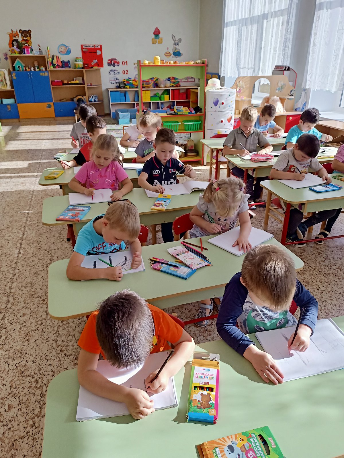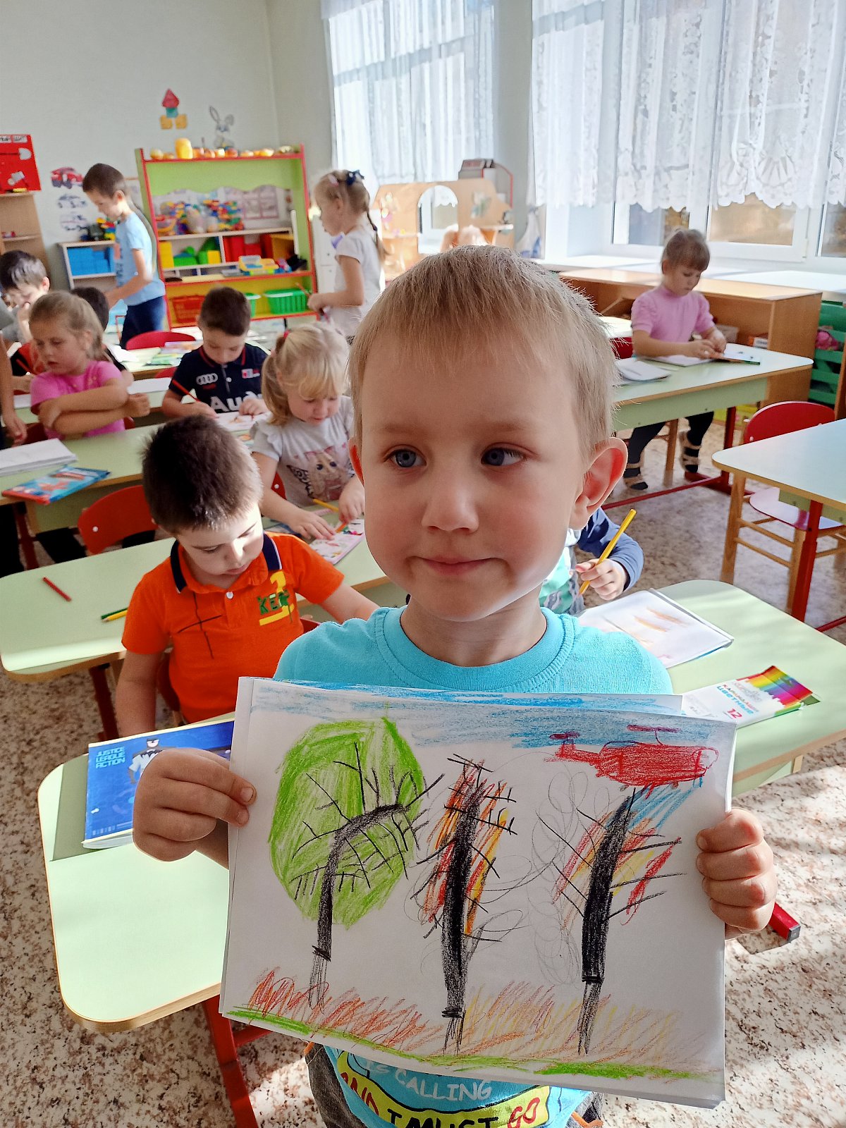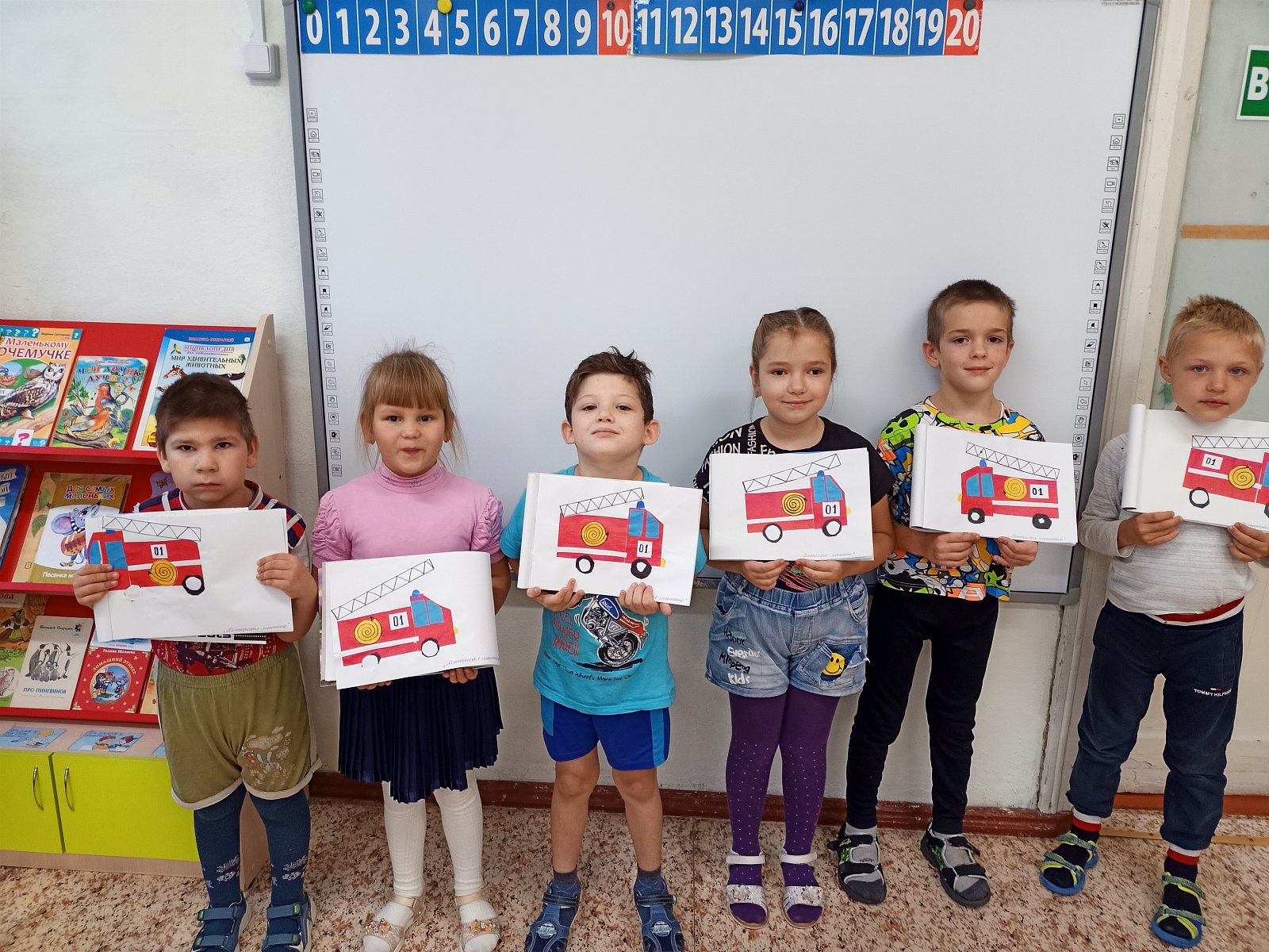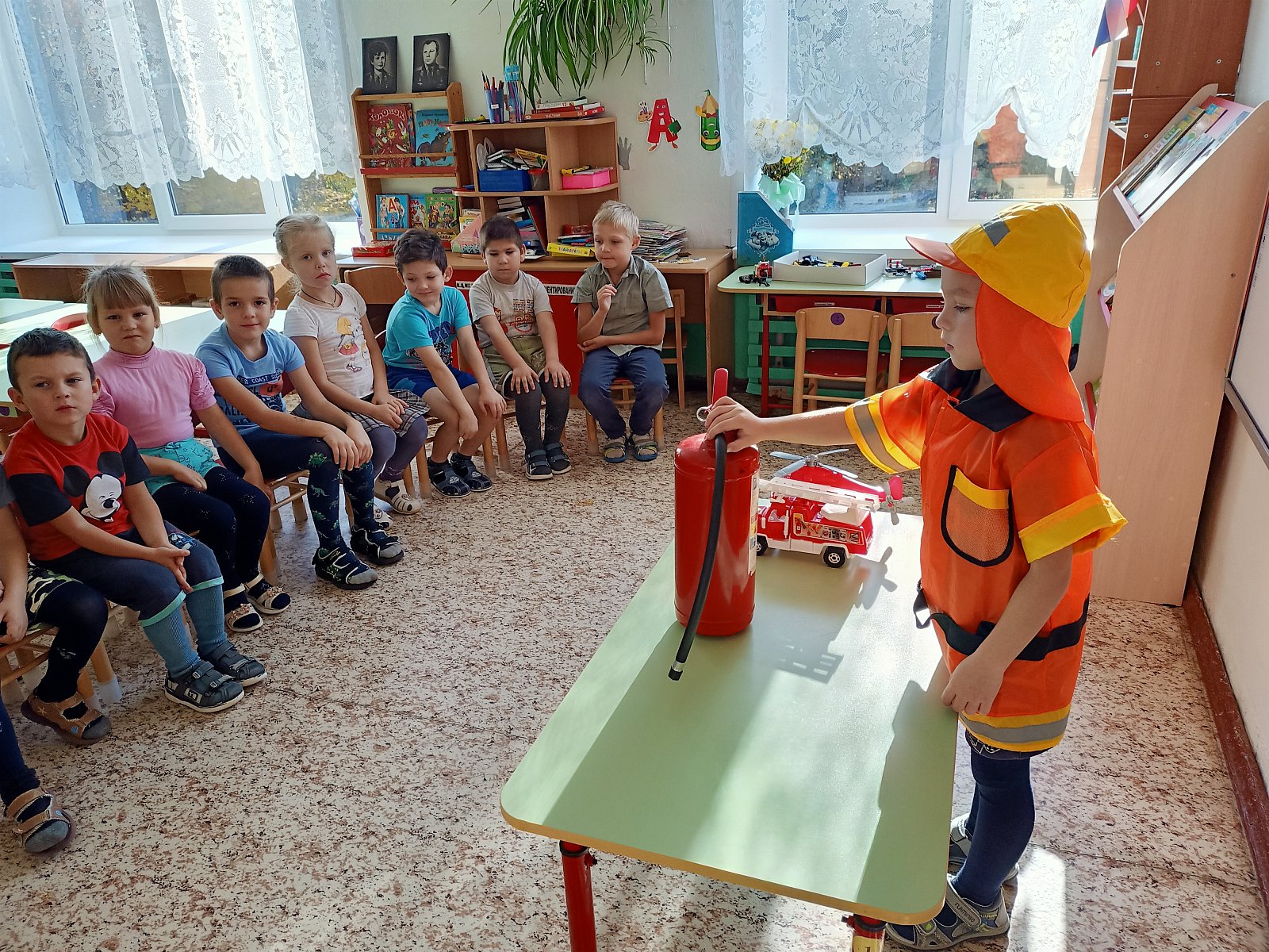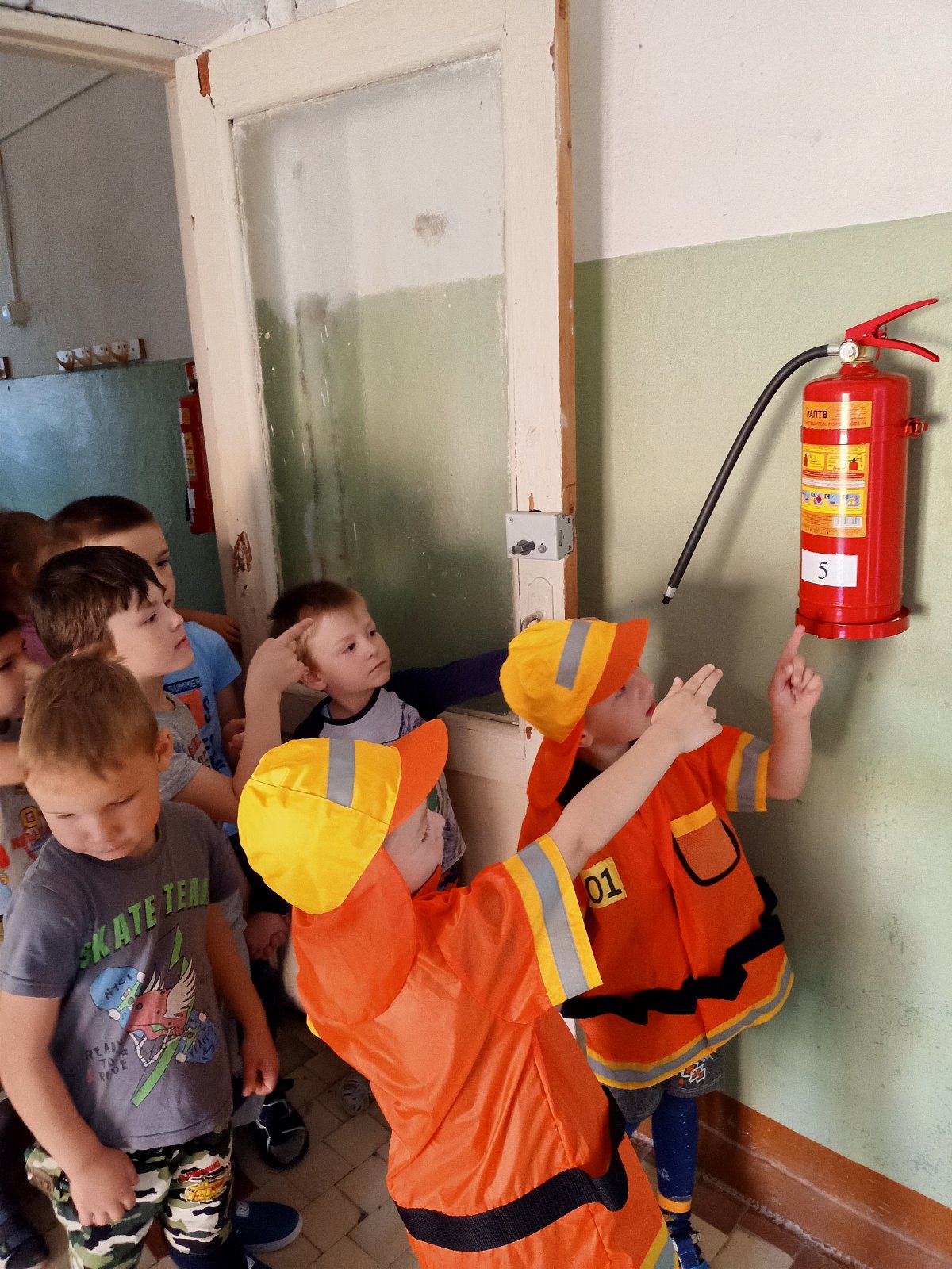 В старшей разновозрастной группе «Смешарики» прошло занятие «Чрезвычайные ситуации. Наши действия». Юные пожарные познакомили дошкольников с огнетушителем и правилами поведения при пожаре; на занятиях по изо воспитанники подготовительной группы выполняли аппликацию «Пожарная машина», старшая группа рисовали на тему «Спасем лес от пожара». Дошкольники познакомились с планом эвакуации и совместно со взрослыми прошло практическое занятие «Действия при эвакуации»