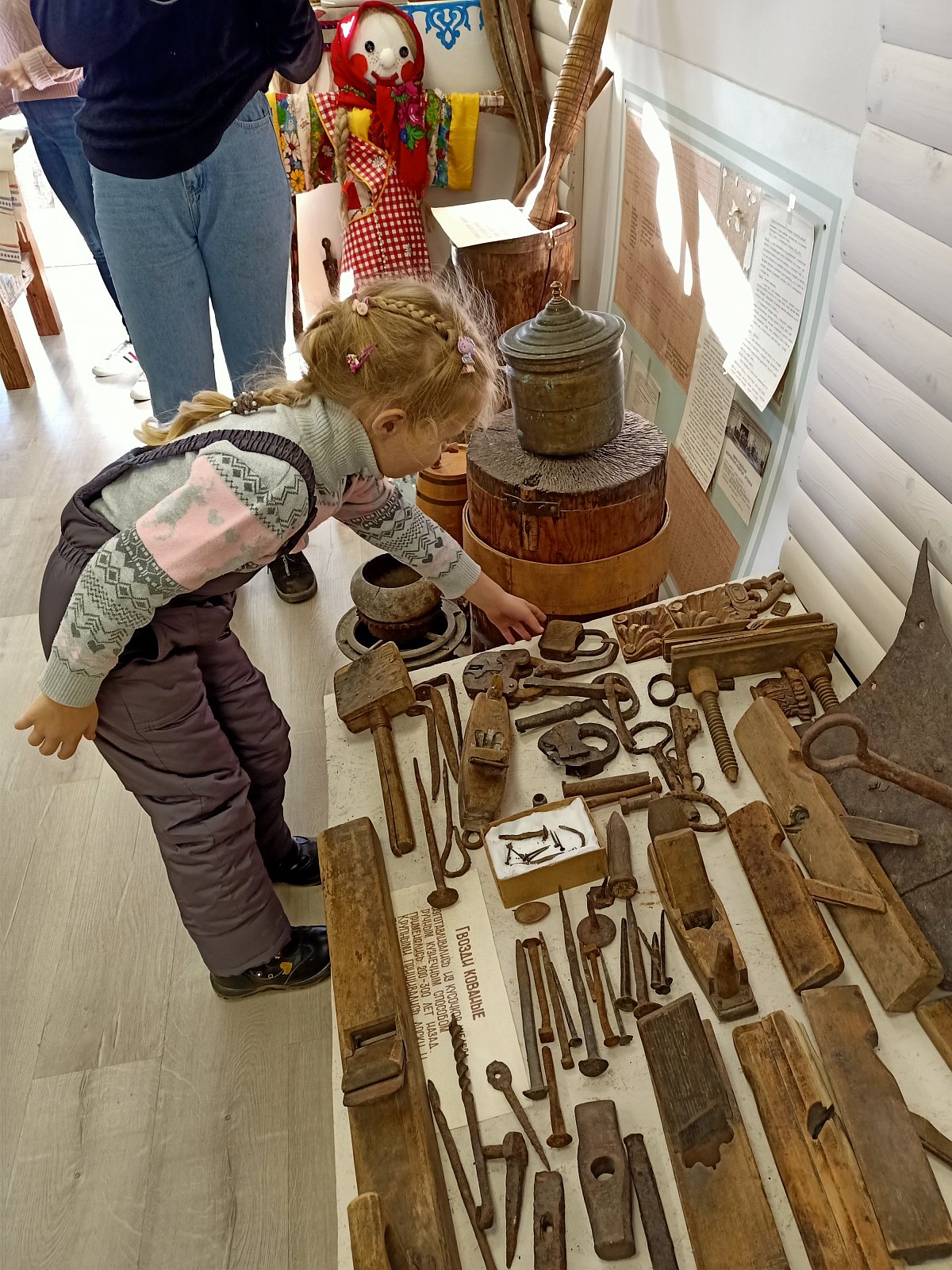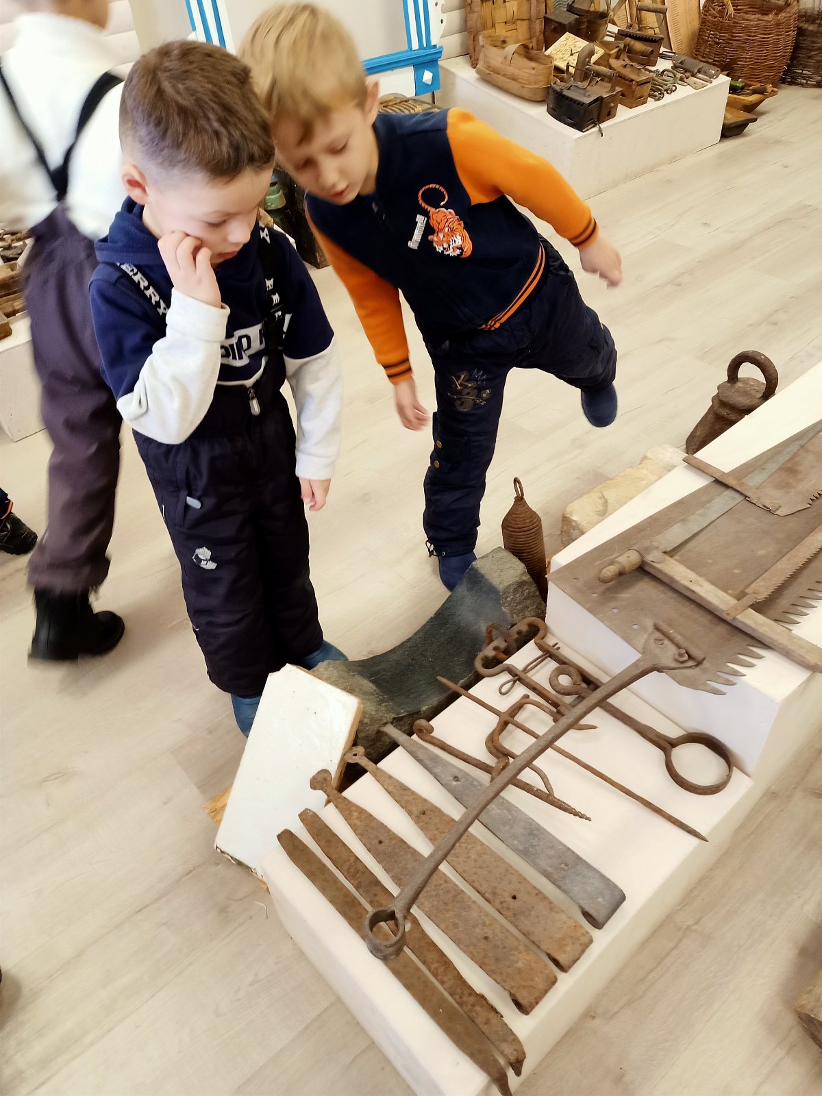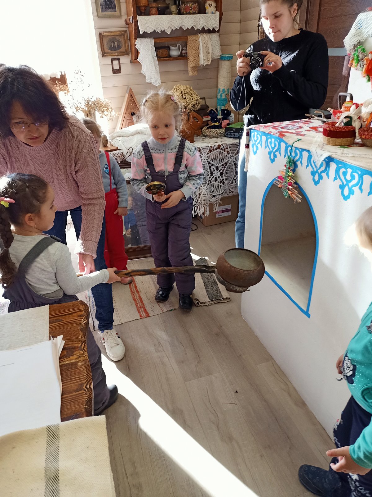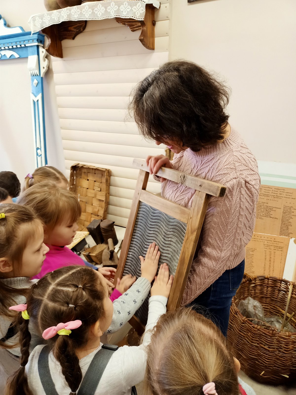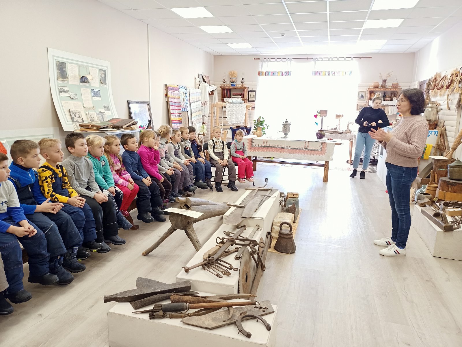 16 ноября воспитанники старшей - подготовительной группы МБДОУ «Светлячок» совершили экскурсию в Дом культуры в краеведческий музей. Работник Дома Культуры, Жирякова Светлана Викторовна радушно встретила ребят и провела очень интересную и познавательную экскурсию по залу музея с разными экспозициями, которые помогли понять и увидеть быт наших предков. В «русской избе» дошкольники познакомились с предметы связанные с печью: кочергой, старинной посудой. Ребята узнали о том, что коромысло изготавливали из липы, осины, ивы – древесина, которых отличается легкостью, гибкостью, упругостью, увидели старинные часы, посуду. Девочек заинтересовали утюги, ткацкий станок, коромысло, а мальчиков - старинные инструменты, подковы, серпы. В музеях экспонаты трогать нельзя, а в нашем Черкутинском краеведческом музее ребята не только потрогали, но попробовали их в деле: ухватом поставили чугунки в печку, прошлись с коромыслом, подержали утюги, разглядели прялку. Старое уходит, но его нужно знать и беречь. Русская старина вся пронизана добром, а это очень важно в наши дни, и особенно актуально для детей дошкольного возраста. Приобщая детей к истокам Русской народной культуры, мы развиваем личность ребёнка. Народная мудрость гласит: «Не забывайте старь – она новизну держит».