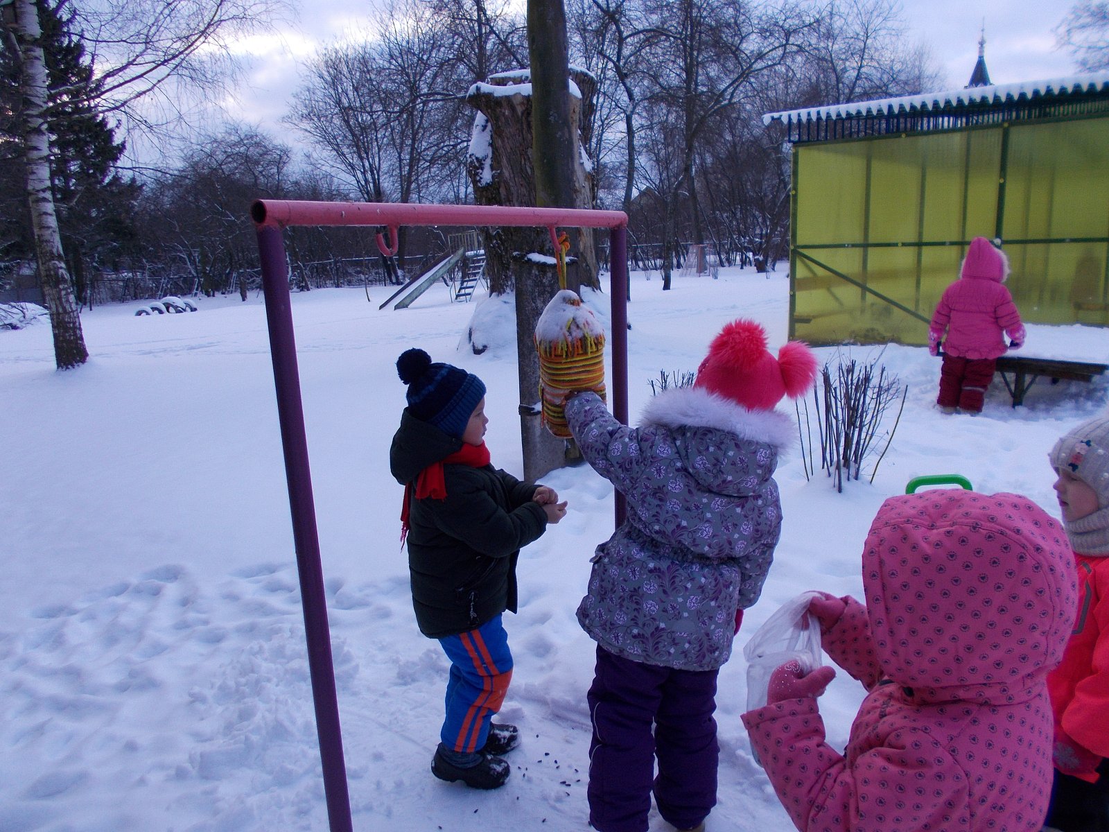 С 2002 года проводится ежегодная Всероссийская эколого-культурная акция «Покормите птиц!». В группе «Пчелка» прошла неделя «Зимующие птицы». Воспитатель Кондратьева М.Н. провела с ребятами беседы о зимующих птицах, рассматривали иллюстрации про птиц, сравнивали их по оперению, читали рассказы о птицах, смотрели фильм о зимующих птицах, заучивали стихи, отгадывали загадки, пели песни, лепили птиц из пластилина, играли в подвижные игры: «Воробушки и автомобиль» «Птички и ветерок». В конце недели провели развлечение «В гости к зимующим птицам». Во время прогулки, повесили кормушки, накрошили в нее хлебных крошек и насыпали зерна. Очень скоро птицы привыкнут к тому, что здесь постоянно есть для них корм, и начнут прилетать к нашим кормушкам. Мы думаем, что птицы будут рады угощению! Принимайте участие в акции, повесьте у своего дома кормушку и наблюдайте за пернатыми гостями.