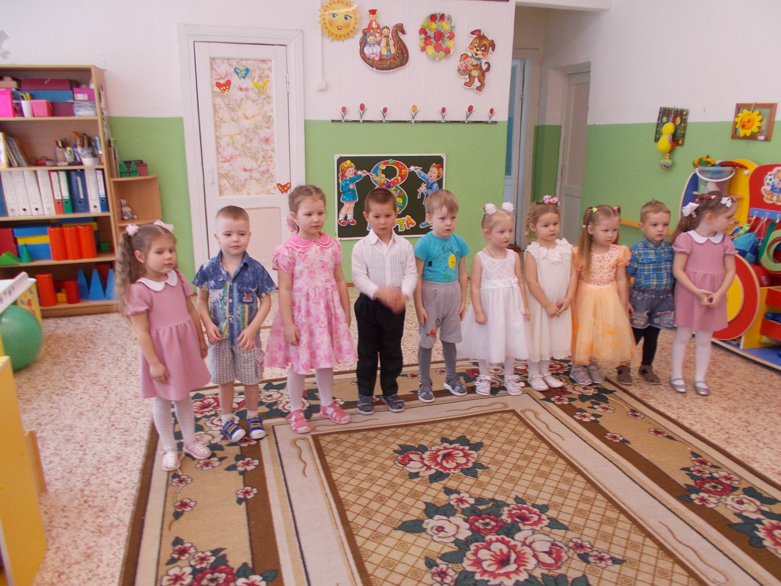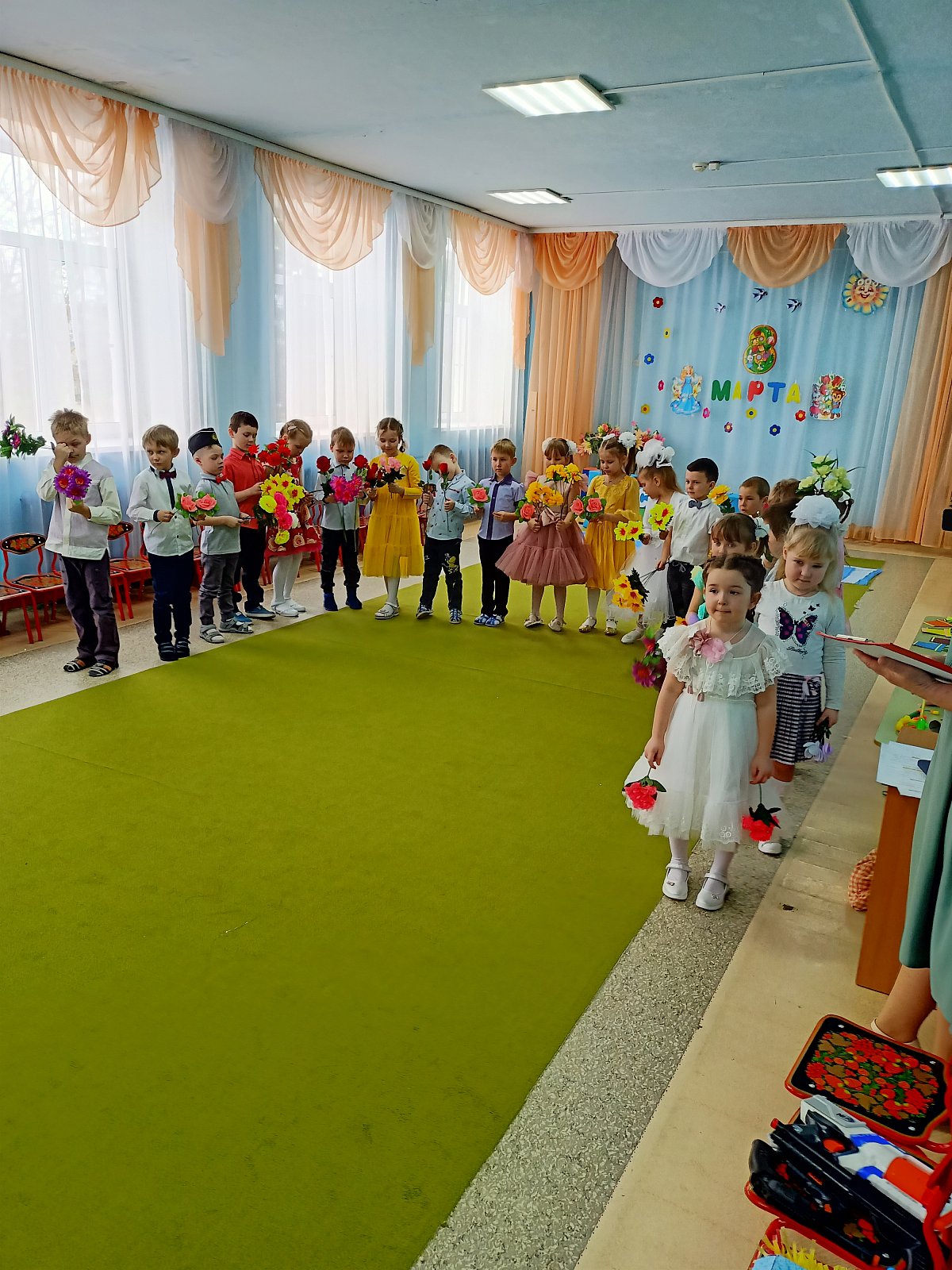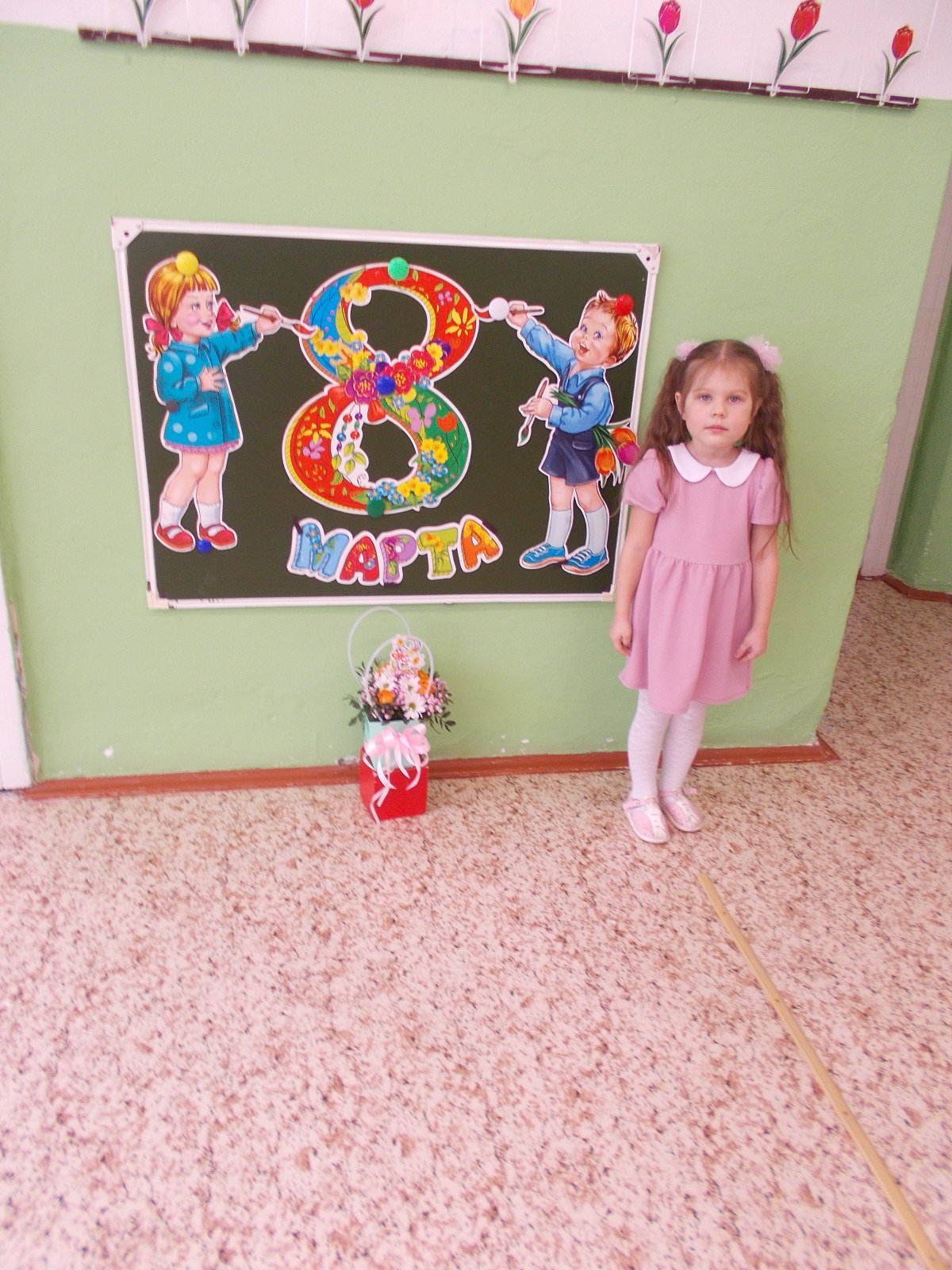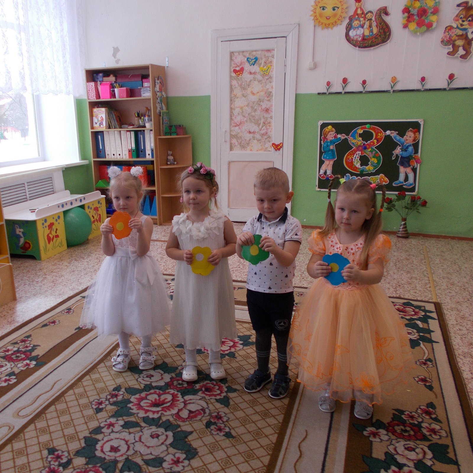 Проведена большая предварительная подготовка к празднику:воспитатели с детьми читали рассказы, проводили беседы о мамах, бабушках, сестрёнках; на занятии по рисованию мы нарисовали красивые цветы; разучивали стихотворения, песни и танцы. Для любимых мам изготовили подарки: поделки своими руками, украсили группу.