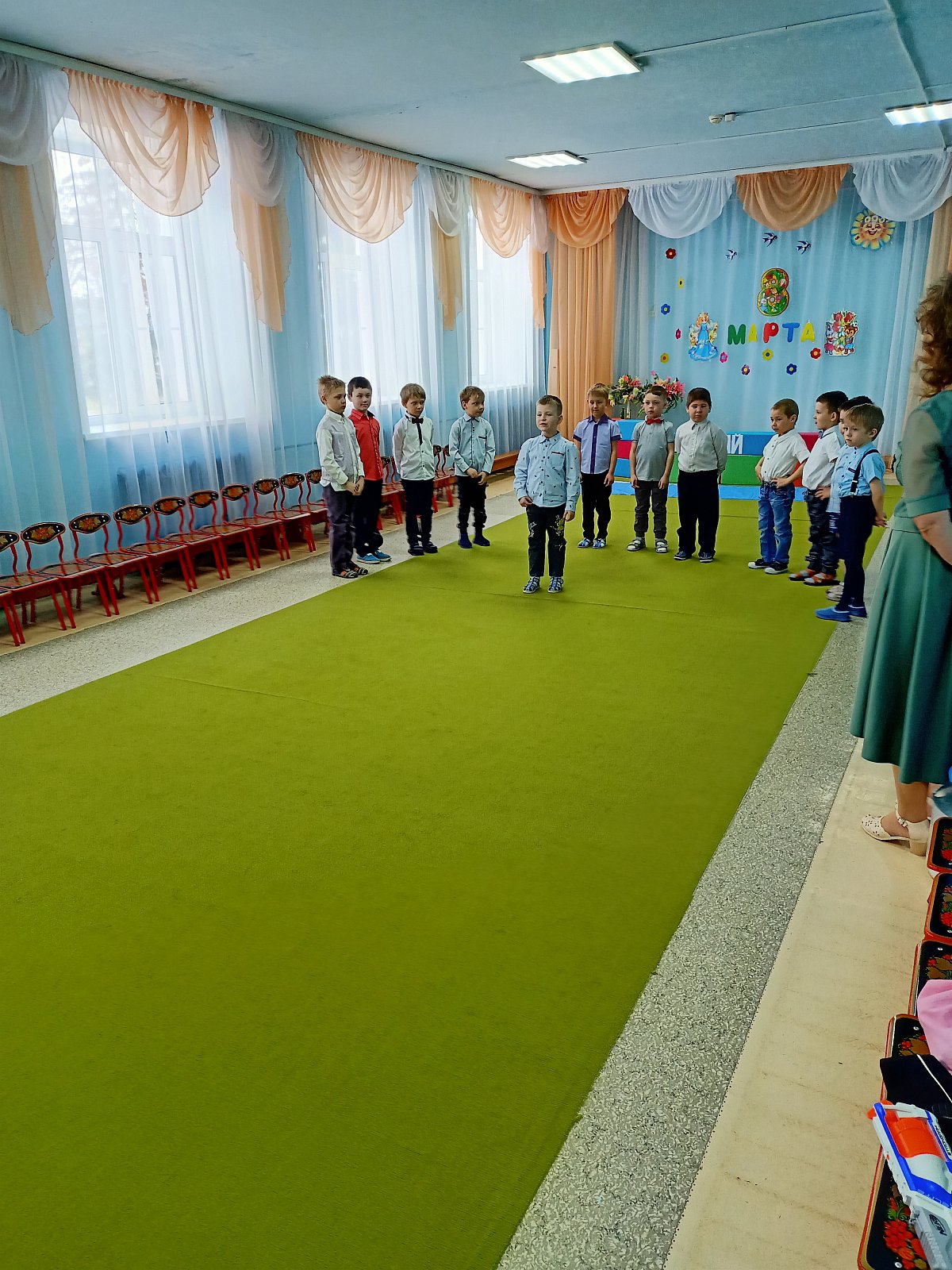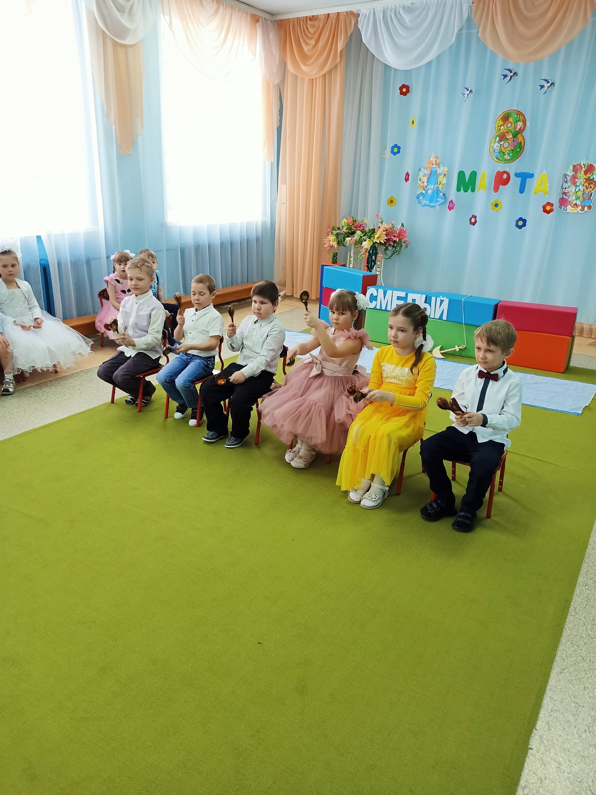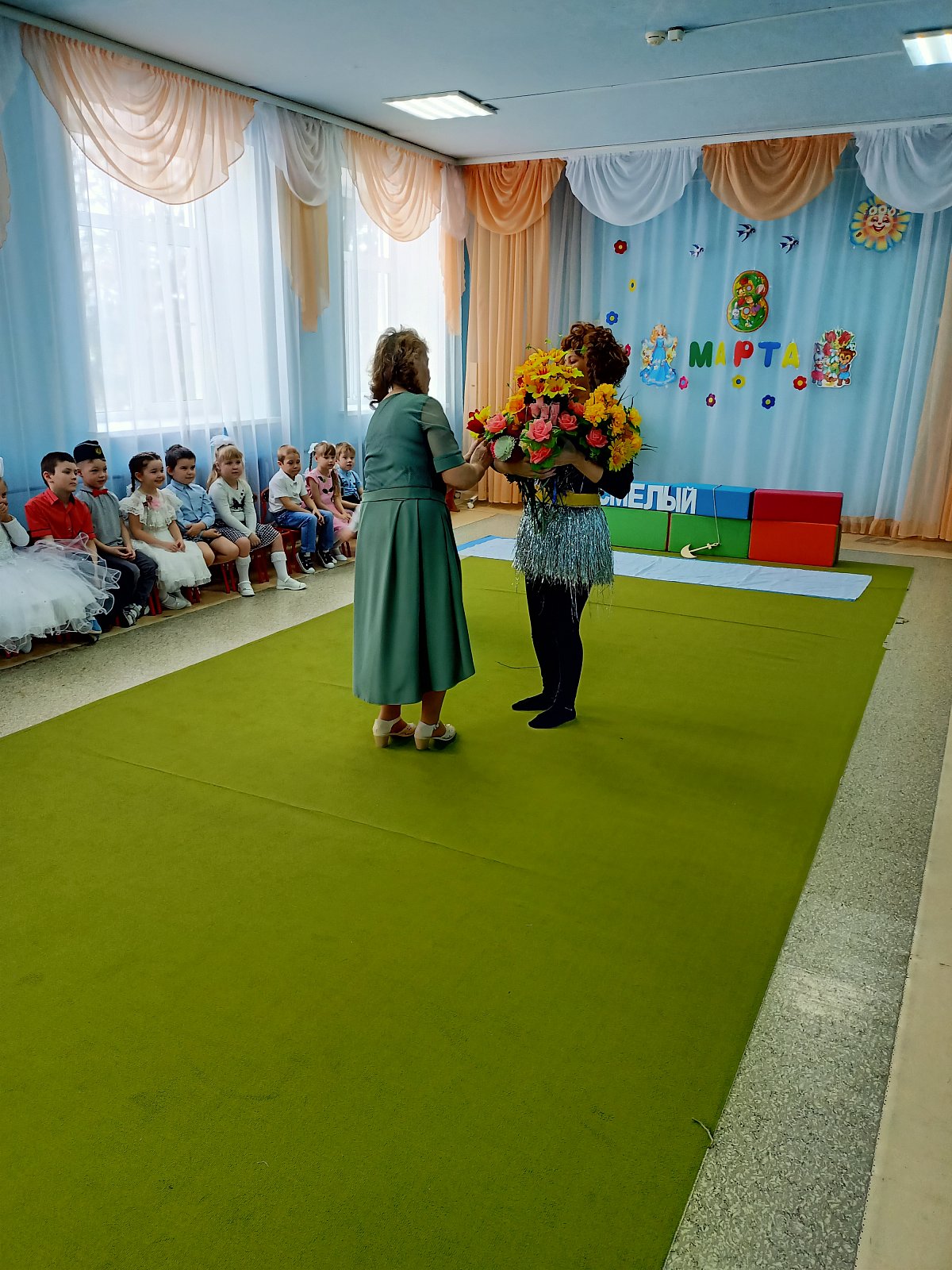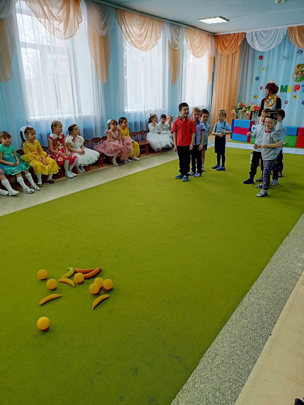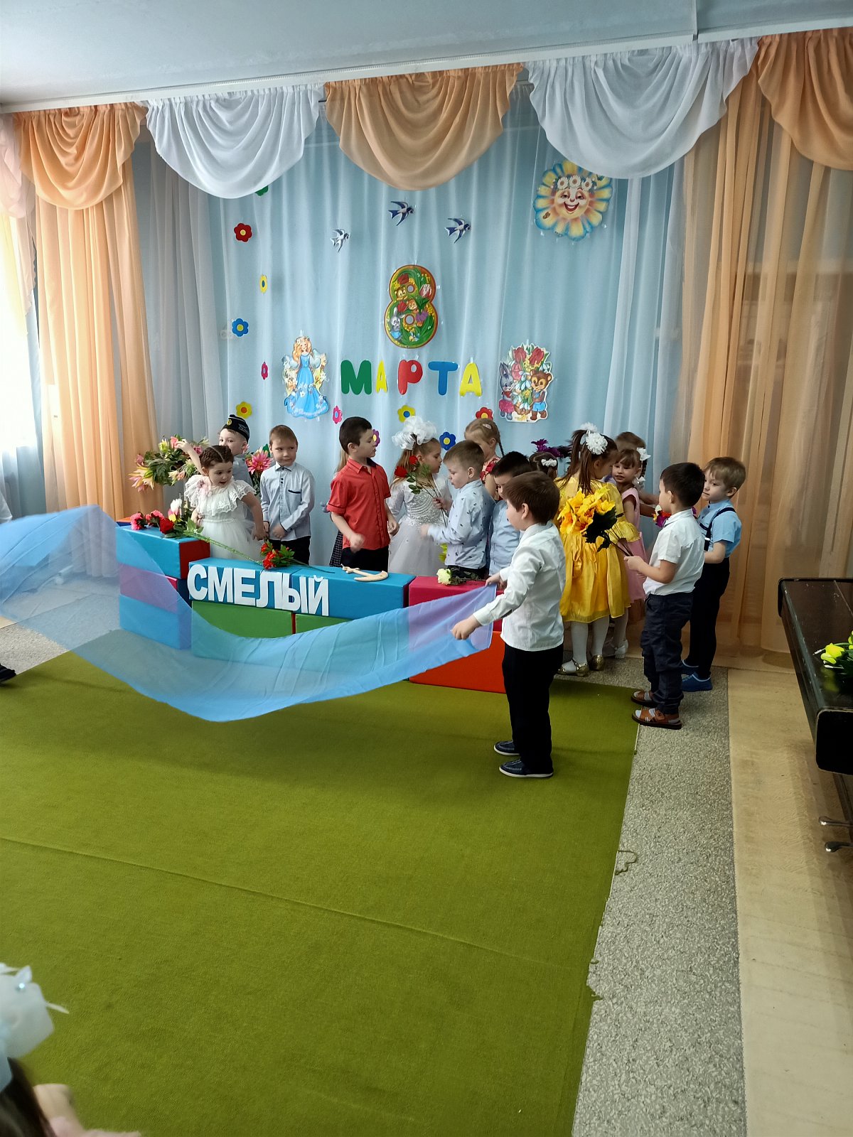 А в старшей группе "Смешарики" прошел утренник "Путешествие на необитаемый остров", где дошкольники встретились с Чунгой-Чангой, местной жительницей.Путешествие за цветами получилось незабываемым. Дети ловили рыбу в море, танцевали с Чунгой-Чангой, собирали бананы и кокосы, за что Чунга-Чанга подарила детям прекрасные цветы. Дети пели песни для мам, читали стихи и,конечно, танцевали любимые танцы "Семечки", "Салажата", с цветами.