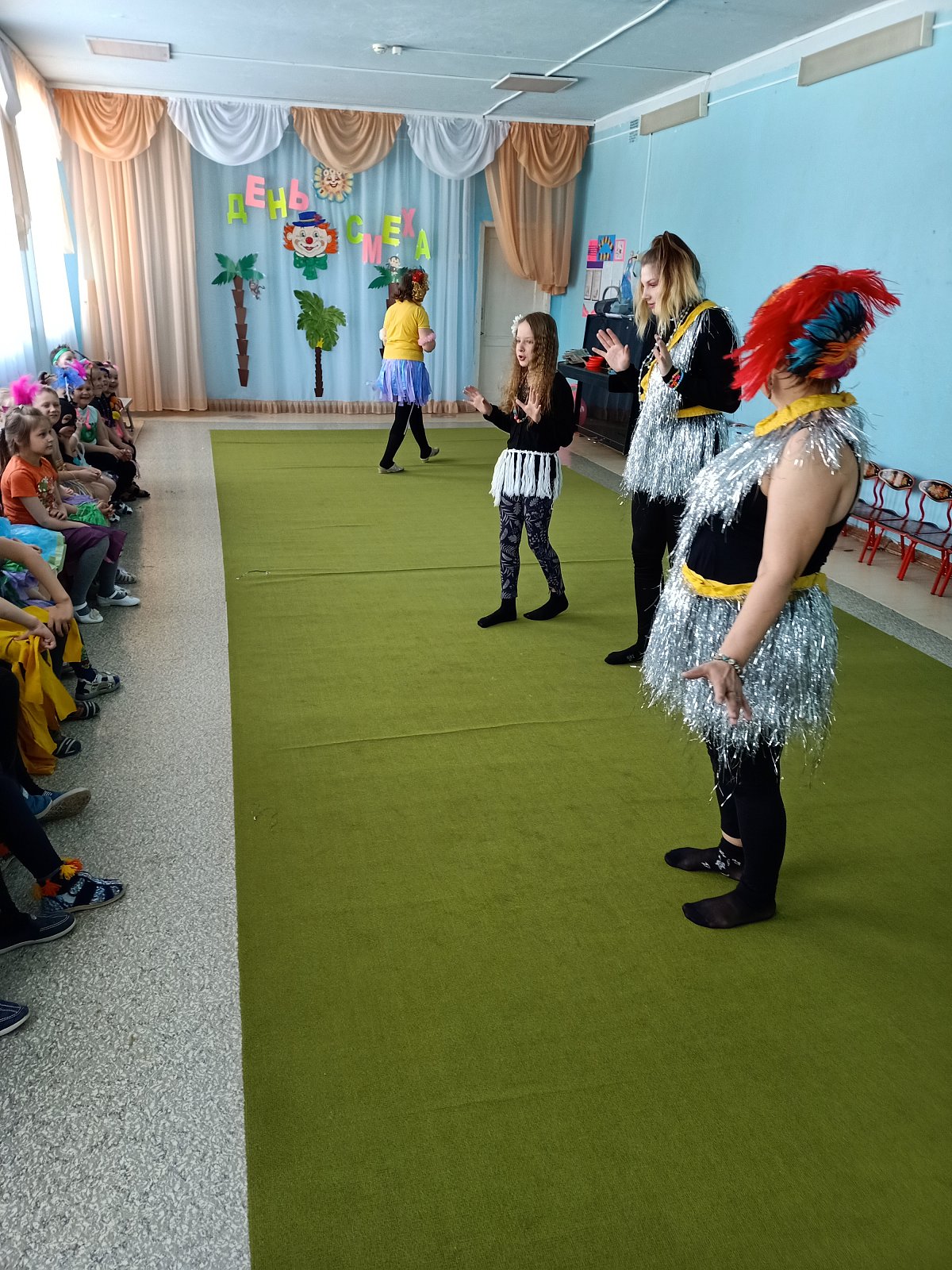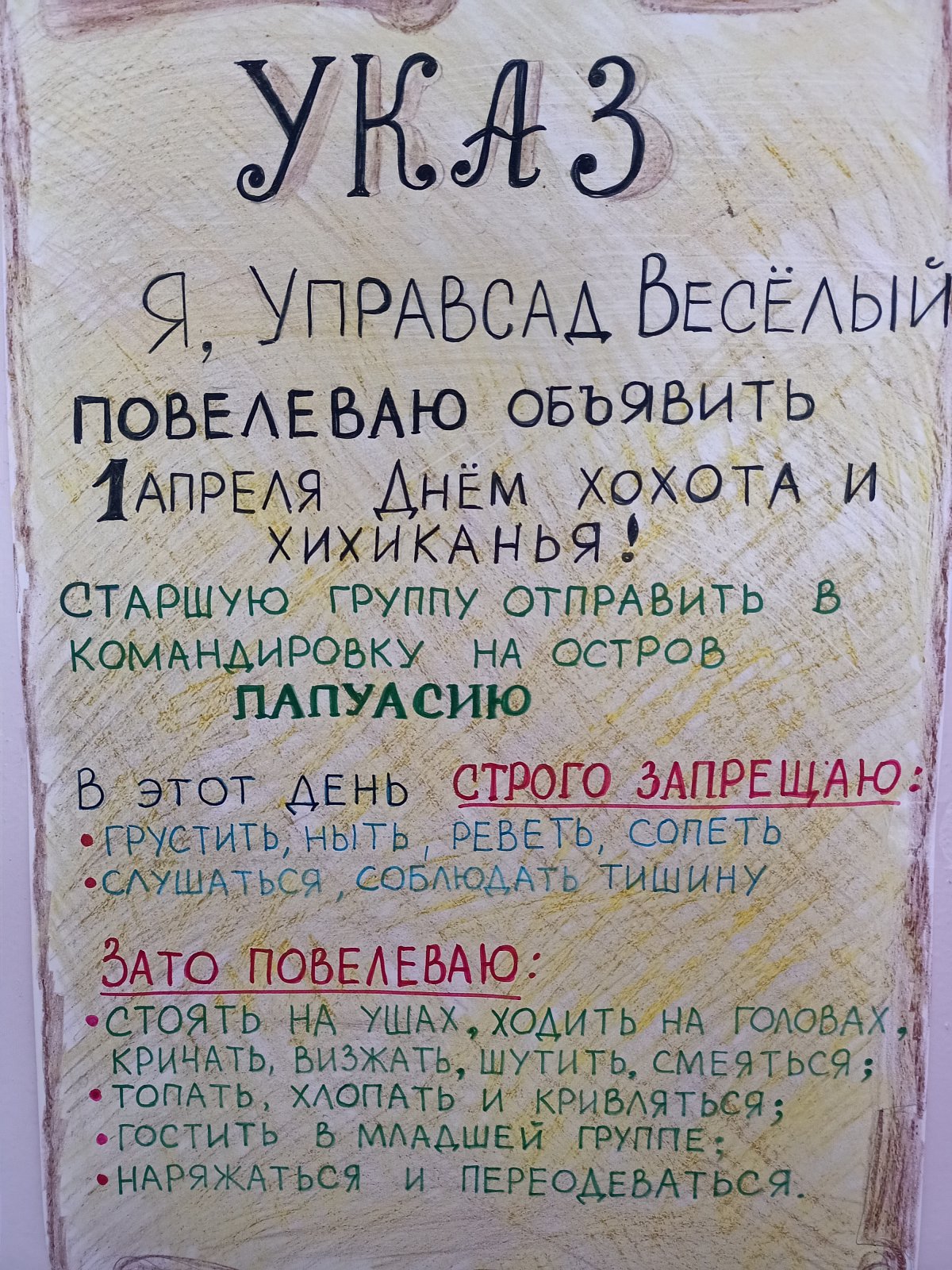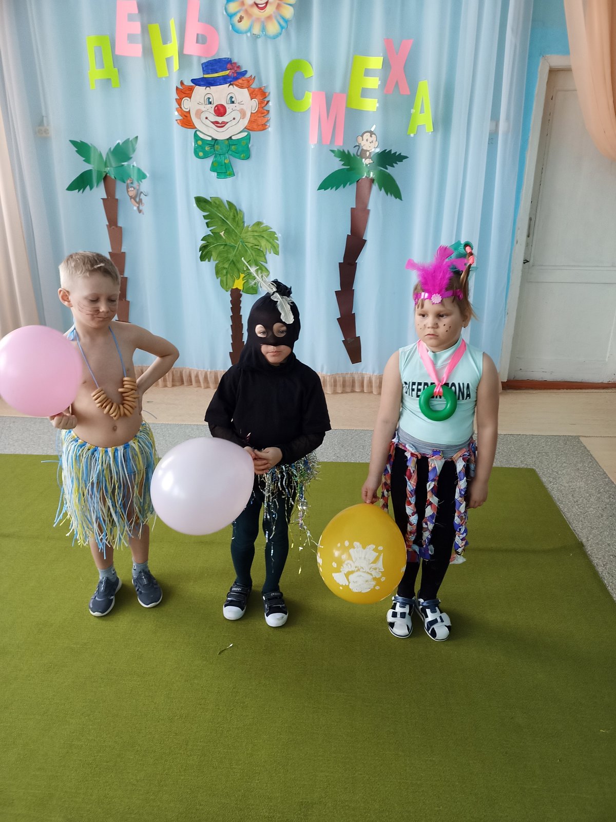 1 апреля, в день смеха, ребята старшей группы «Смешарики» превратились в настоящих папуасов и по УКАЗУ УПРАВСАДА ВЕСЕЛОГО отправились в путешествие на остров Папуасию. Попасть туда можно было только на воздушных шариках. На острове дошколят встретили местные жители Тумба и Юмба. Ребятам, как настоящим папуасам, пришлось преодолевать разные испытания – собирать кокосы, а потом уложить их в ящики для отправки друзьям из младшей группы. Потом надо было «добыть еды на обед». В этом детям помогли большие мячи - прыгуны. Ребята превращались в удивительных животных. А ещё наши папуасы прыгали как обезьяны. Путешествие закончилось любимым танцем жителей Папуасии «Тумба - Юмба». Как всегда, наши родители не остались в стороне и изготовили «папуасские наряды» своим детям. Огромная благодарность Вам, уважаемые родители, за это. Такие праздники очень любят дети, ведь они приносят массу впечатлений и положительных эмоций и не дают скучать ни детям, ни взрослым.