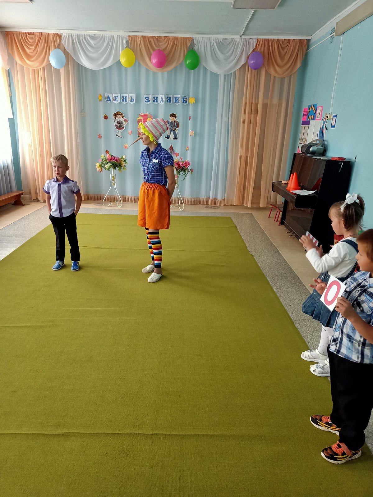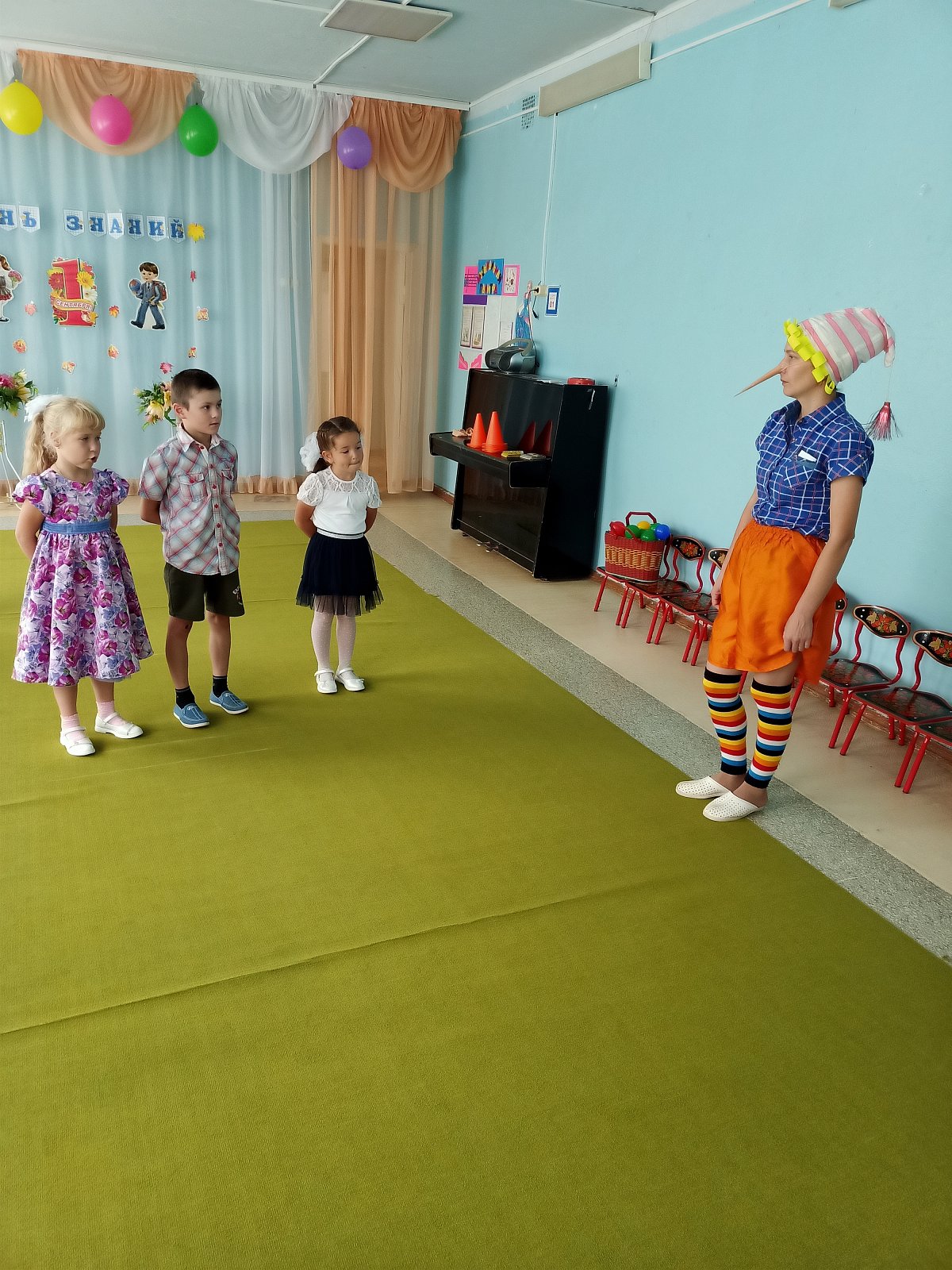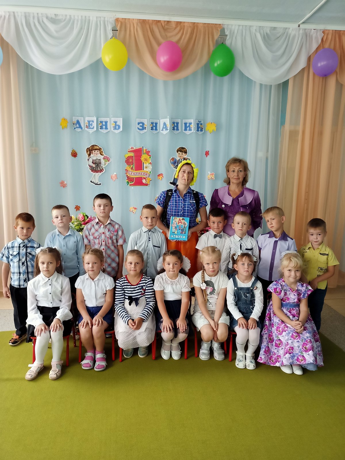 В этот день для воспитанников детского сада старшей группы «Смешарики» педагоги устроили настоящий праздник. На День Знаний к ребятам пришёл веселый Буратино, который не хотел учиться, а хотел только играть и веселиться. Но дети рассказали ему, чему учат в школе, зачем нужны знания и что было бы, «Если б не было школ». Дошкольники вместе с Буратино участвовали в конкурсах: «Собери портфель», «Кто быстрее найдет свою букву», играли в игру «Математический горох», танцевали, разгадывали загадки, пели песни, шутили и смеялись. И убедили Буратино, что учиться - это очень интересно и увлекательно. На прощание дети подарили ему новую азбуку и проводили в школу. Вот так весело, интересно и празднично начался новый учебный год в группе «Смешарики».