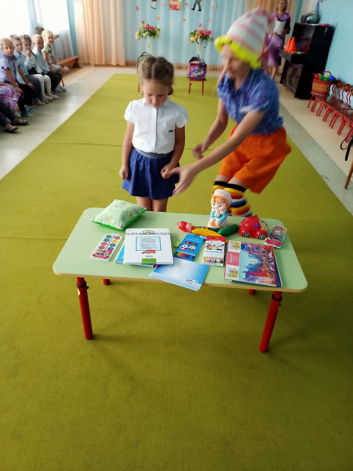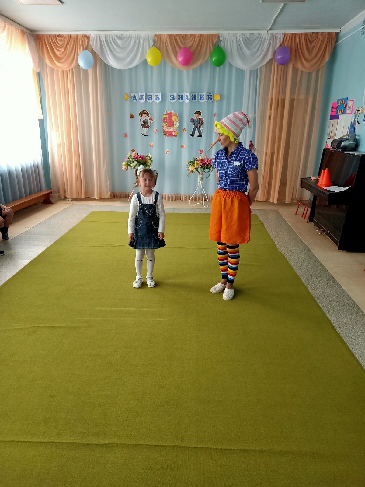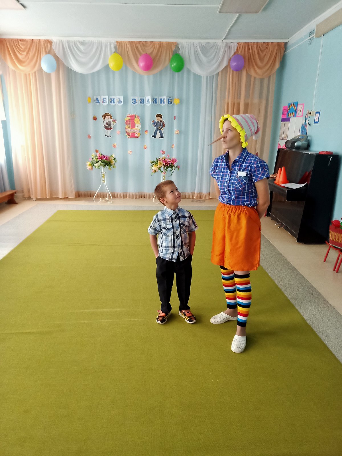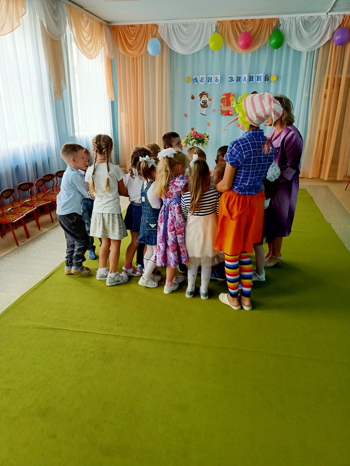 В этот день для воспитанников детского сада старшей группы «Смешарики» педагоги устроили настоящий праздник. На День Знаний к ребятам пришёл веселый Буратино, который не хотел учиться, а хотел только играть и веселиться. Но дети рассказали ему, чему учат в школе, зачем нужны знания и что было бы, «Если б не было школ». Дошкольники вместе с Буратино участвовали в конкурсах: «Собери портфель», «Кто быстрее найдет свою букву», играли в игру «Математический горох», танцевали, разгадывали загадки, пели песни, шутили и смеялись. И убедили Буратино, что учиться - это очень интересно и увлекательно. На прощание дети подарили ему новую азбуку и проводили в школу. Вот так весело, интересно и празднично начался новый учебный год в группе «Смешарики».