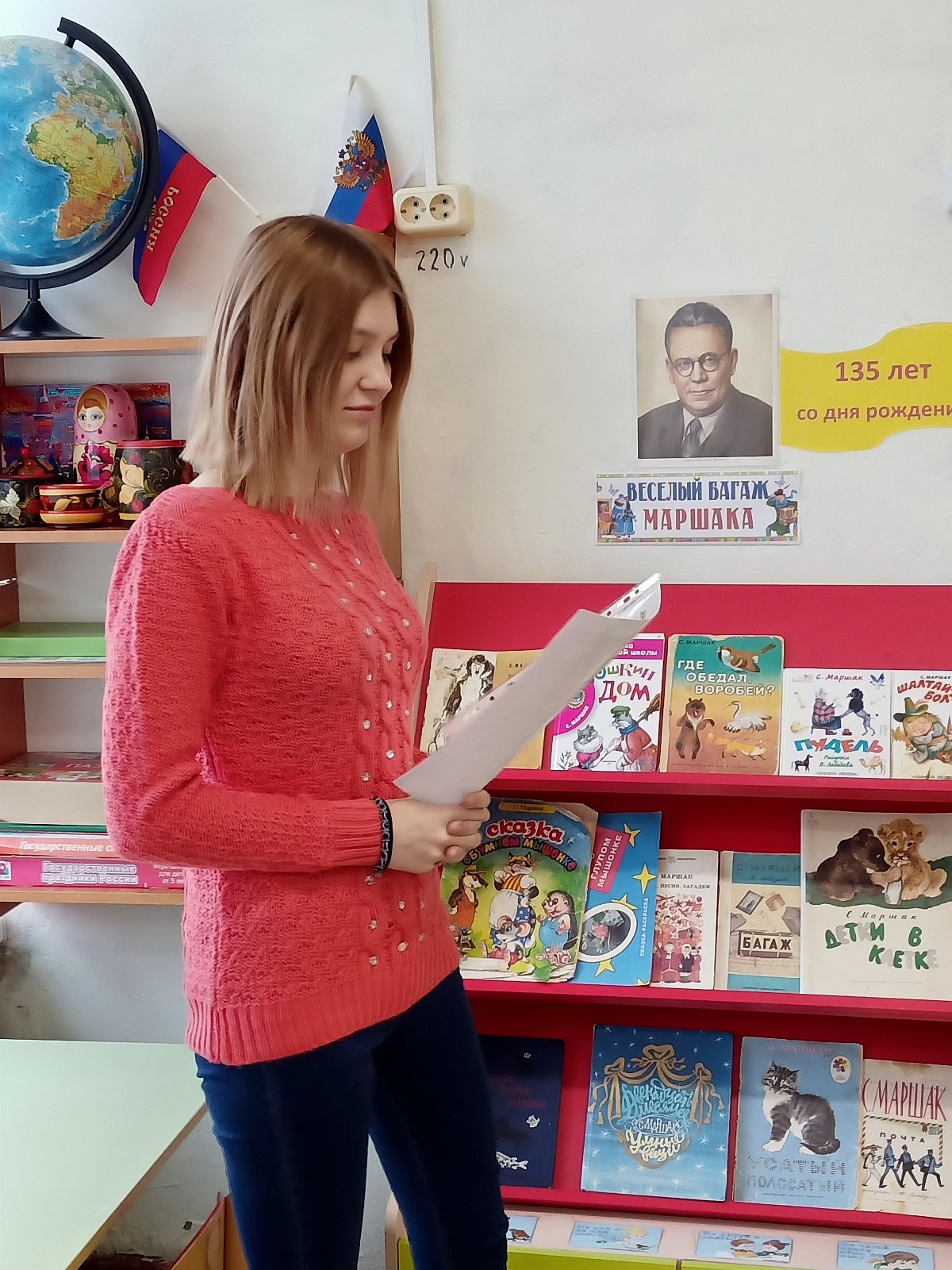В преддверии юбилея С. Я. Маршака, 135 - летия со дня рождения, которое будет отмечаться 3 ноября, для воспитанников старшей группы «Смешарики»» 1 ноября было проведено мероприятие «В гостях у Маршака», К этому дню была оформлена выставка детских книг поэта «Веселый багаж Маршака» и выставка детских рисунков «Герои Маршака». В гости к ребятам пришла библиотекарь Арина Максимовна, она познакомила детей с краткой биографией поэта, рассказала о его жизненном пути, его творчестве, заслугах и наградах. Ребята также узнали, что творчество С.Я. Маршака для детей разнообразно. С большим удовольствием дети отгадывали загадки, участвовали в викторине по произведениям С.Я.Маршака, играли в игру «Продолжи строчку» по стихотворениям: «Вот какой рассеянный» и «Где обедал воробей?» Ребята вспоминали нянек из «Сказки о глупом мышонке» Проведённое мероприятие способствовало популяризации творческого наследия С. Я. Маршака и привитию любви к чтению у дошкольников.