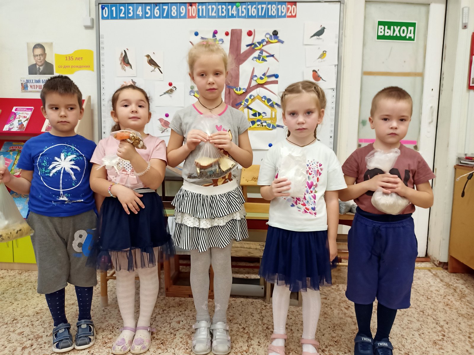 Ребята подготовили кормушки для птичек и принесли корм для них, закрепив знания о том, чем можно кормить птичек зимой. Вечером смотрели мультфильмы «История про воробья Кузьму и синичку», «Лекарство для синички»