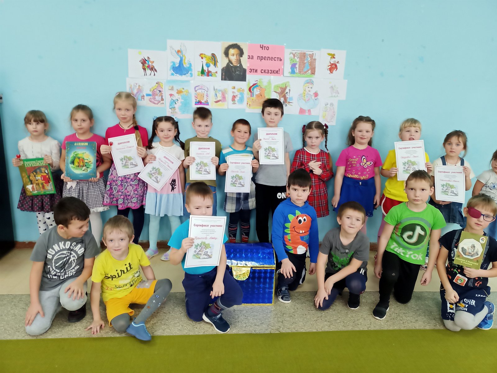 В старшей группе «Смешарики» прошел тематический день, посвящённый этой дате. Дошкольники окунулись в мир пушкинских сказок. В группе была организована выставка рисунков «Что за прелесть эти сказки!» Для ребят была организована литературная викторина «Путешествие по Лукоморью». Дошколята угадывали отрывки из сказок, узнавали сказки по иллюстрациям, отгадывали загадки про сказочных героев, вспоминали окончания фраз из сказок («Подскажи словечко»), собирали пазлы. Особенно детям понравилась игра «Волшебный сундук», где были спрятаны предметы из сказок Пушкина. Ребята должны были назвать сказку, в которой этот предмет встречался. Между конкурсами дети играли в разные игры: «Помоги белочке собрать и расколоть орешки», «Кто быстрее поймает золотую рыбку» Ребята показали хорошее знание сказок Пушкина.