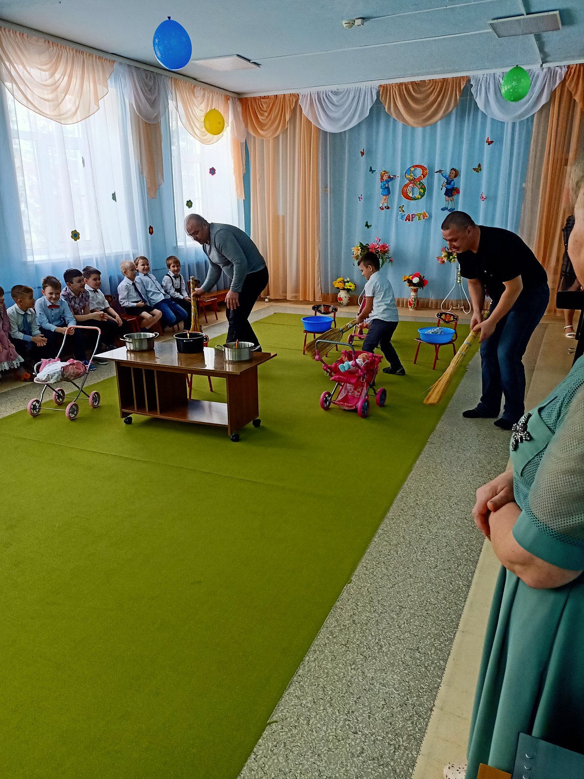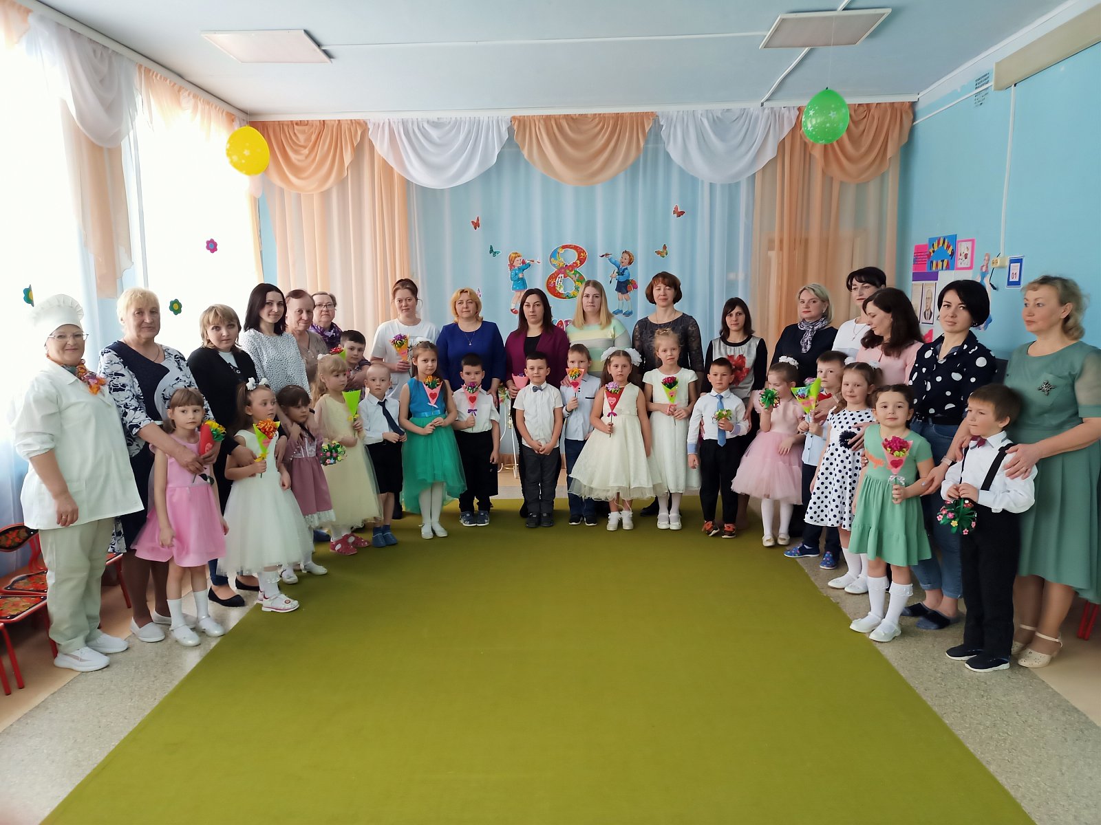 В старшей группе «Смешарики» 7 марта прошел замечательный праздник, посвященный Международному женскому дню. Сценарий отличался тем, что действие происходило в импровизированном кафе под названием Весеннее. Всех гостей приветливо встретил шеф повар. А юные официанты очаровали всех своим танцем. Меню нашего торжества состояло из веселых песен, душевных стихов, зажигательных танцев. Мальчики подарили девочкам частушки. Папы тоже не остались в стороне. Они участвовали в веселом конкурсе «Мамины помощники». Не забыли наши дети выделить и своих бабушек, подчеркнув то, что они стали более современные, следят за модными тенденциями и активно пользуются интернетом. В заключение праздника ребята пригласили своих любимых мам на танец, а потом подарили цветы, сделанные своими руками. Праздник получился интересным, незабываемым, и прошел в душевной, тёплой обстановке. Все мамы остались очень довольны.