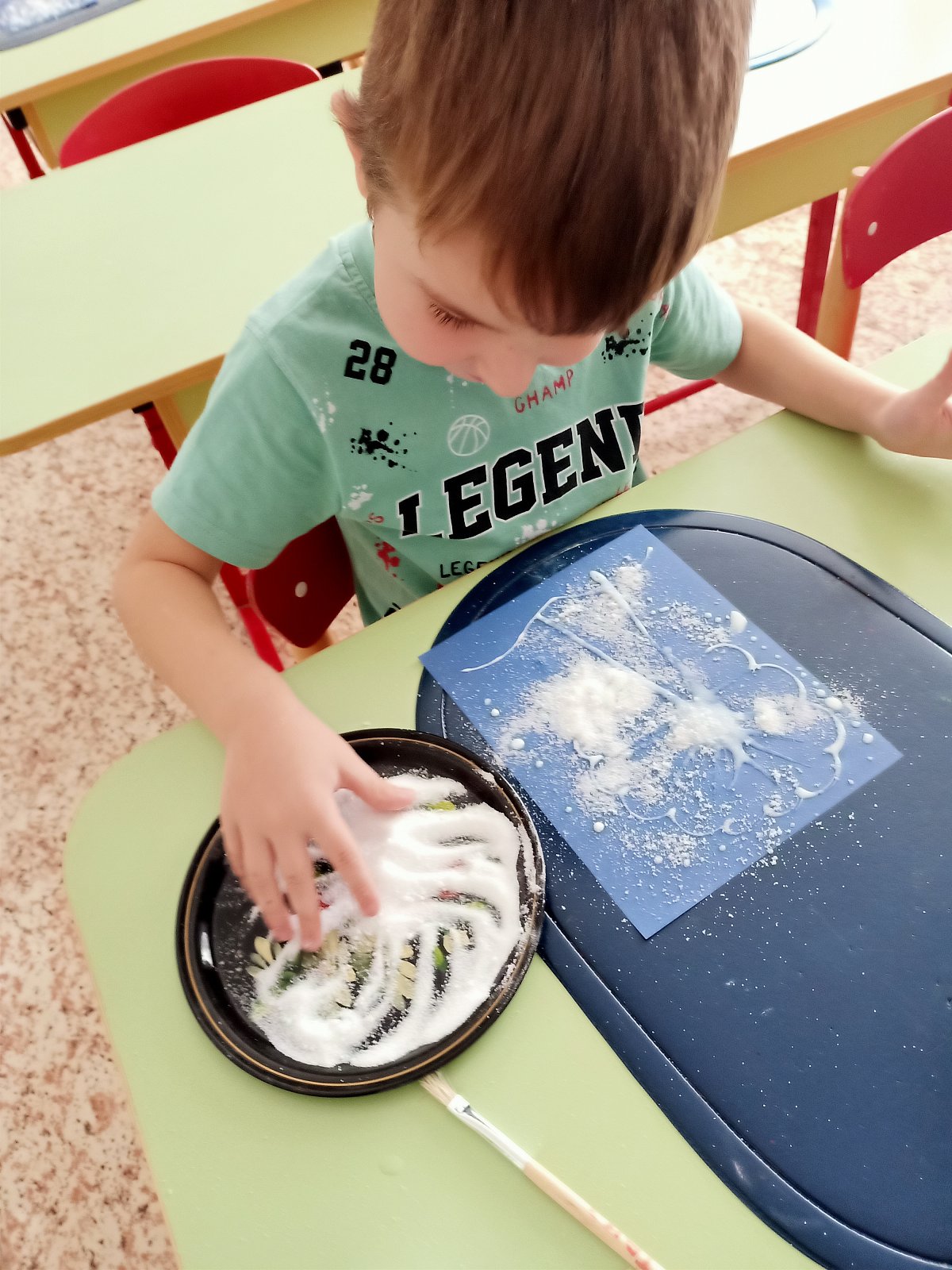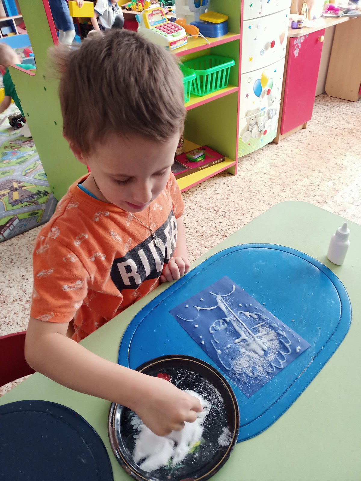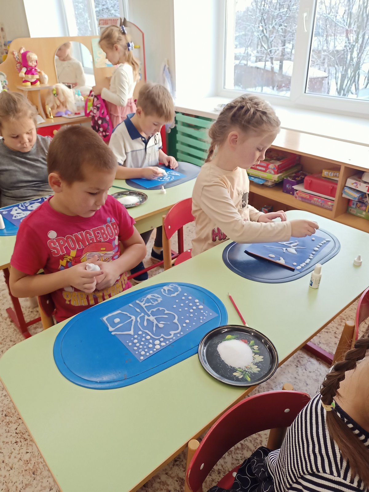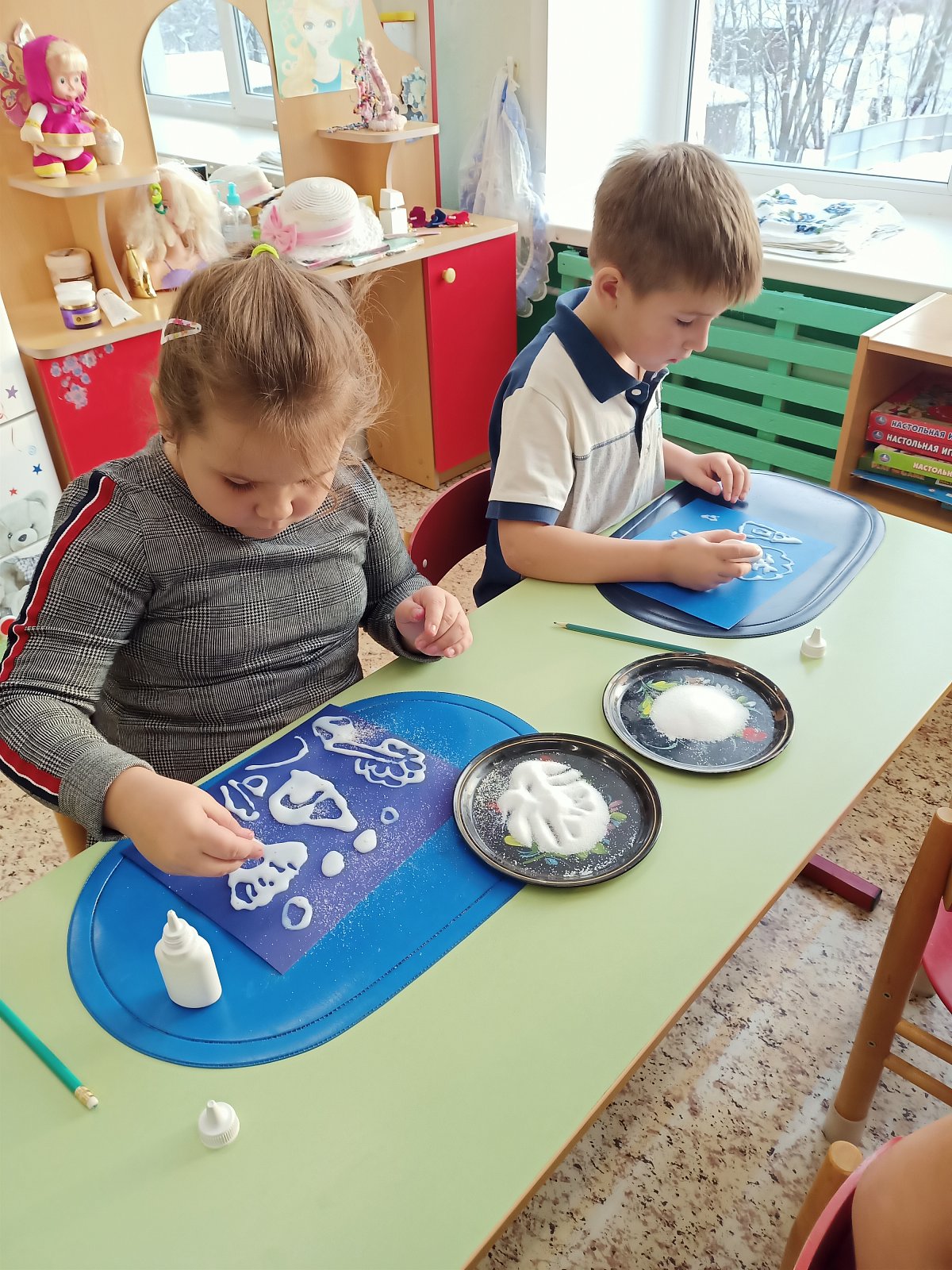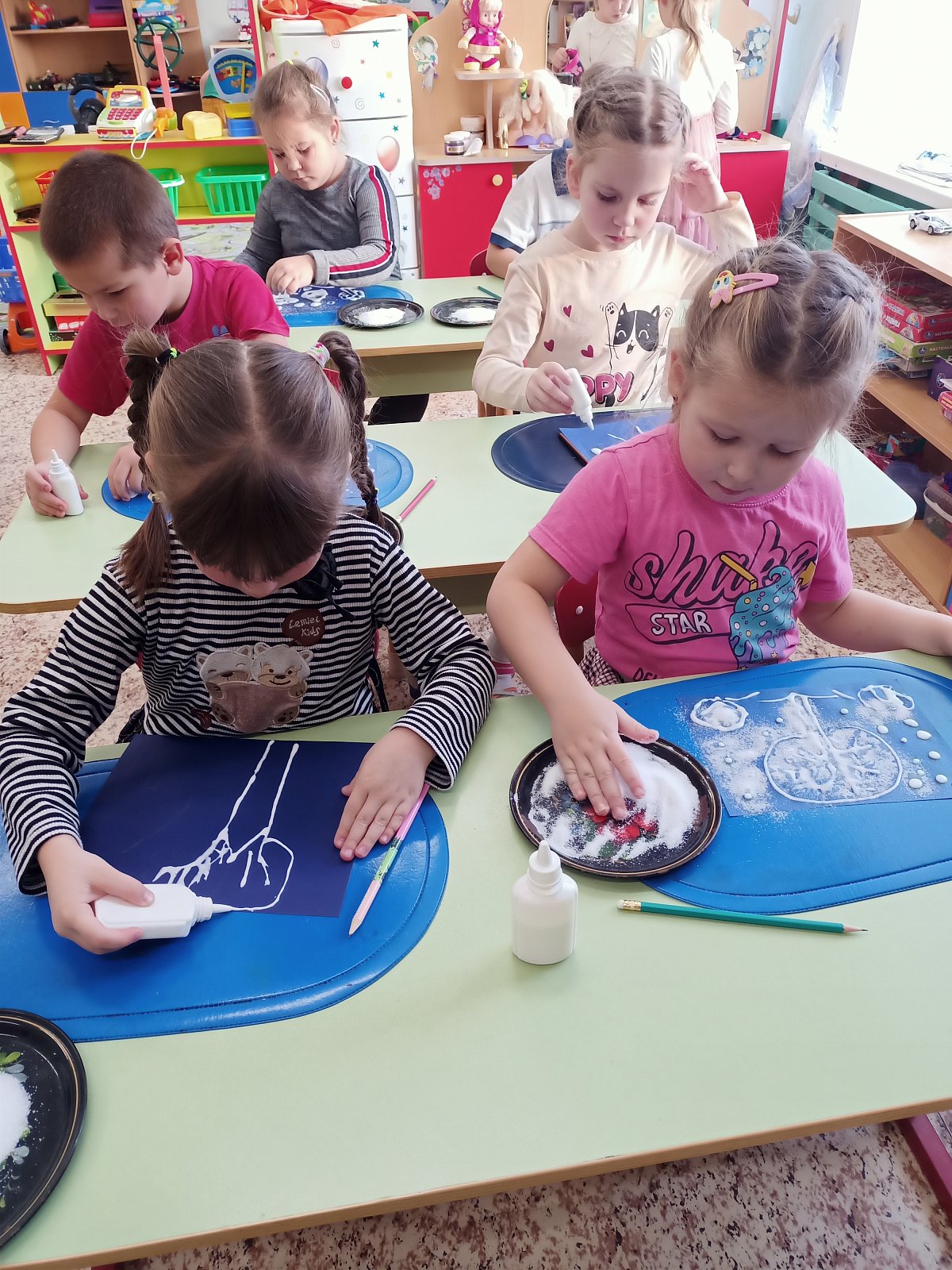 В старшей группе «Смешарики» прошло занятие нетрадиционное рисование солью. Дети с помощью соли и клея нарисовали зимний пейзаж. Оригинальный способ создания картинки вызвал у ребят большую заинтересованность. Рисование солью – это действительно находка для детей, которые любят делать что – нибудь необычное. Кроме того, нетрадиционные способы творчества помогают ребенку раскрепоститься, получить от процесса удовольствие и удивляться результатам. Самое главное в этой технике рисования даже не конечный результат, а сам процесс.