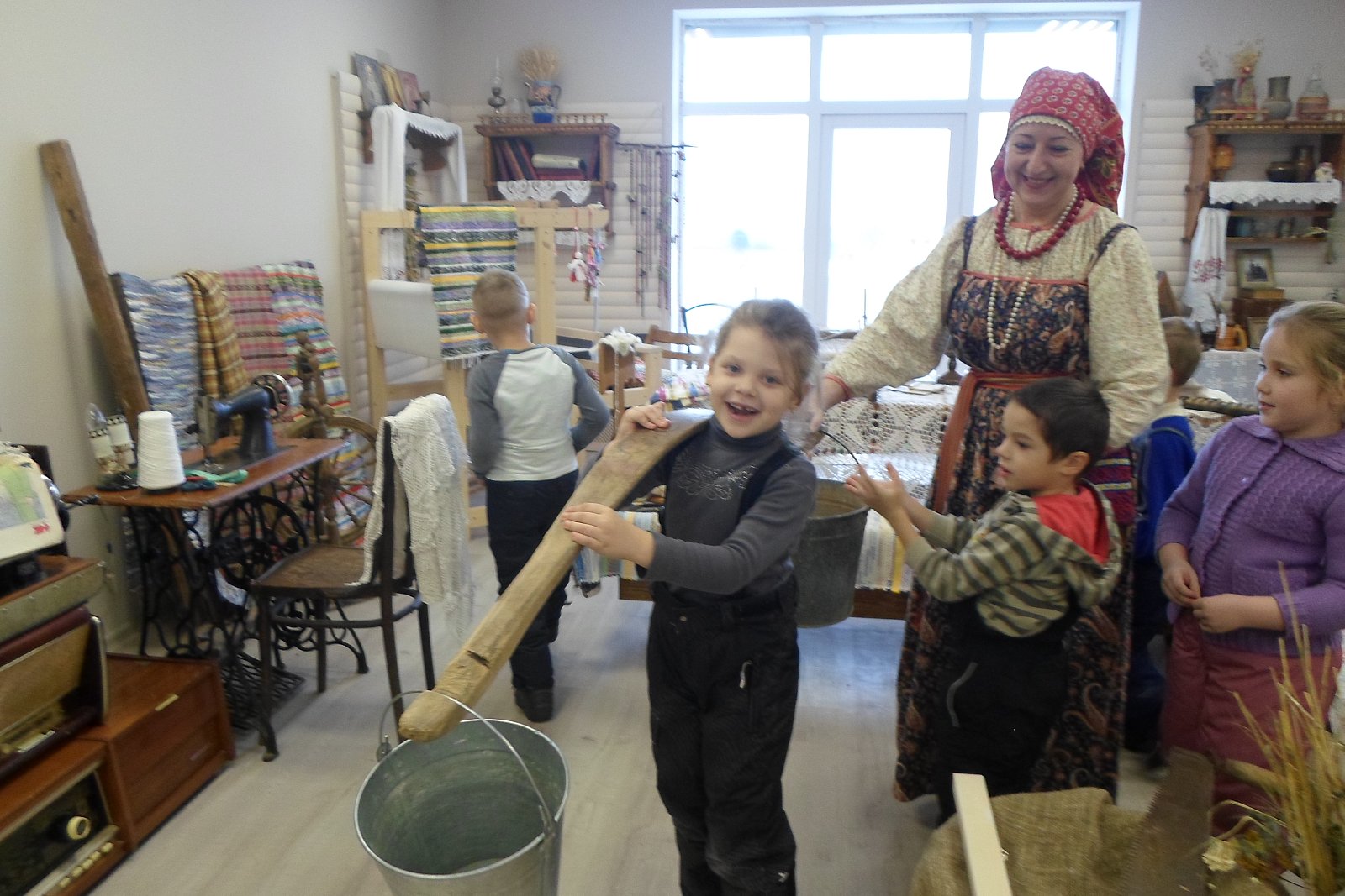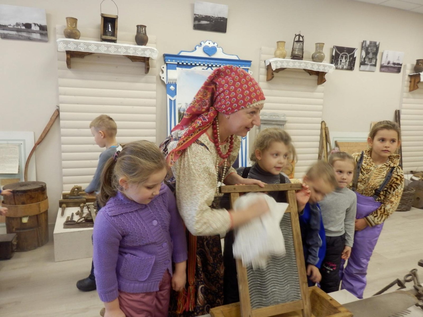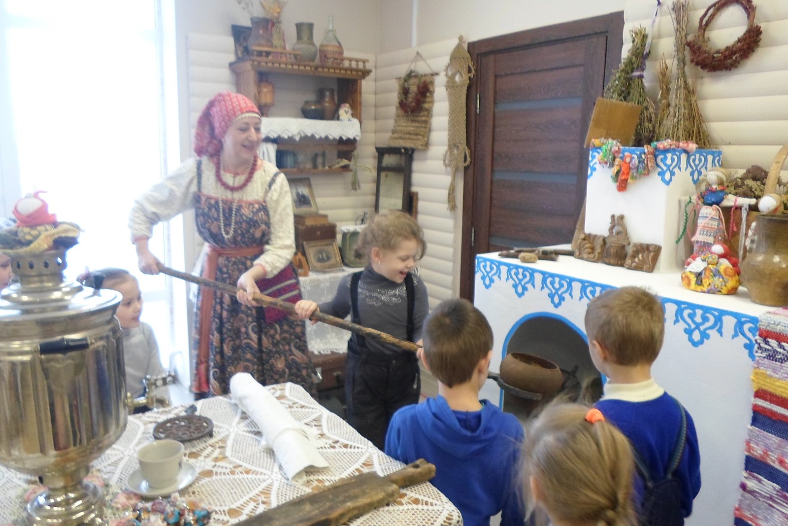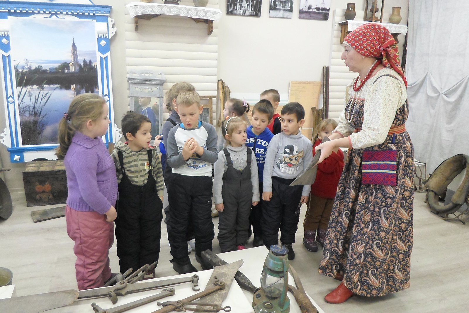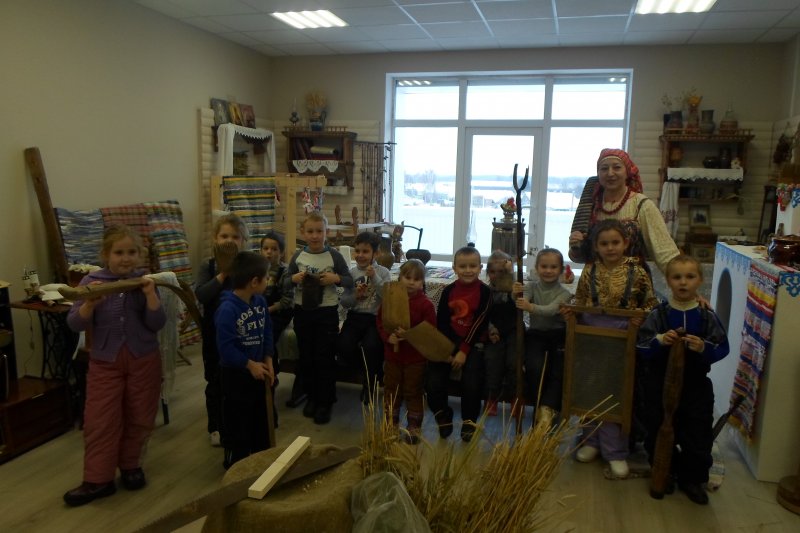 29 ноября воспитанники старшей - подготовительной группы МБДОУ «Светлячок» совершили экскурсию в Дом культуры в краеведческий музей. работник Дома Культуры, Истратова Наталья Викторовна, в русском национальном костюме радушно встретила ребят и провела очень интересную и познавательную экскурсию по залу музея с разными экспозициями, которые помогли понять и увидеть быт наших предков. В «русской избе» дошкольники познакомились с предметы связанные с печью: кочергой, старинной посудой. Узнали о том, что коромысло изготавливали из липы, осины, ивы – древесина, которых отличается легкостью, гибкостью, упругостью, увидели старинные часы, посуду. Девочек заинтересовали утюги, ткацкий станок, коромысло. А мальчиков - старинные инструменты, подковы, серпы. В музеях экспонаты трогать нельзя, а нашем Черкутинском краеведческом музее ребята не только потрогали, но попробовали их в деле: ухватом поставили чугунки в печку, прошлись с коромыслом, подержали утюги, разглядели прялку, увидели, как Наталья Викторовна работает на ткацком станке. Старое уходит, но его нужно знать и беречь. Русская старина вся пронизана добром, а это очень важно в наши дни, и особенно актуально для детей дошкольного возраста. Приобщая детей к истокам Русской народной культуры, мы развиваем личность ребёнка. Народная мудрость гласит: «Не забывайте старь – она новизну держит».