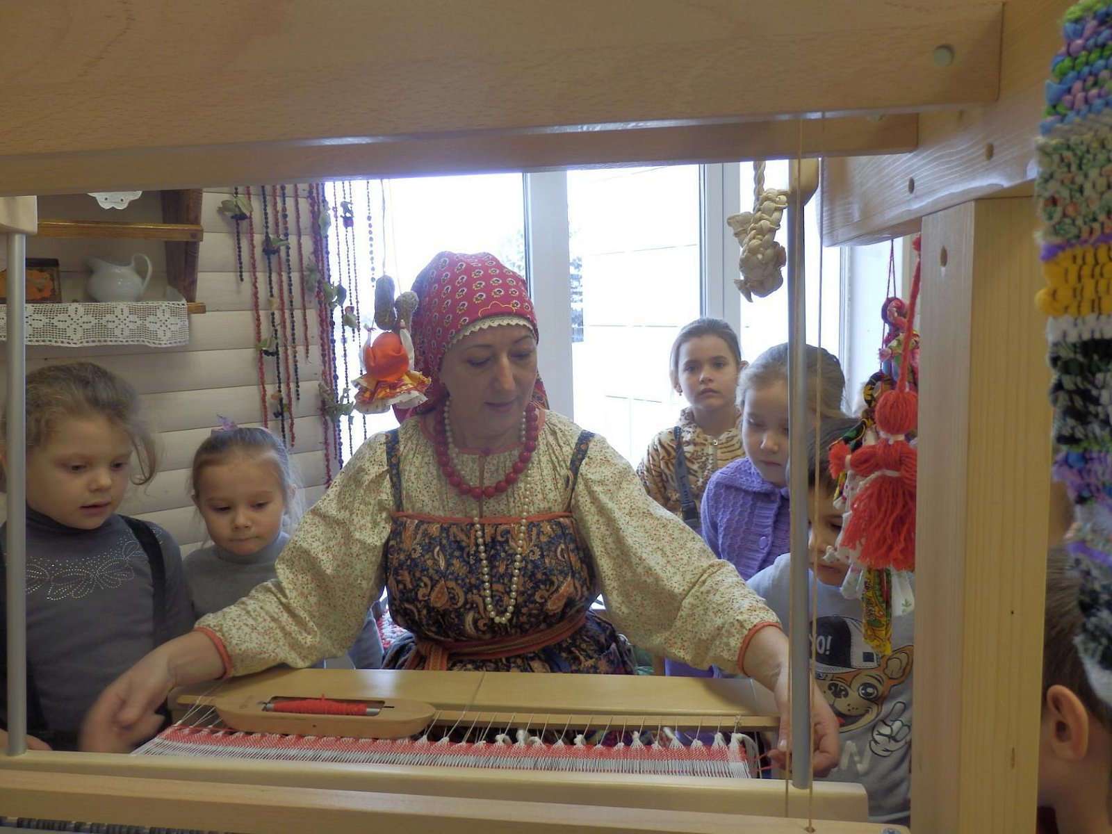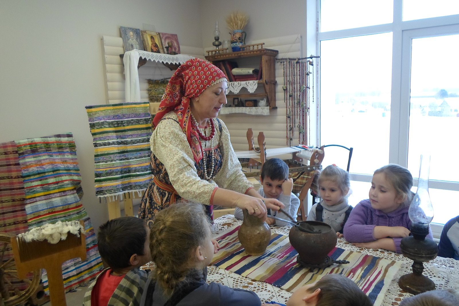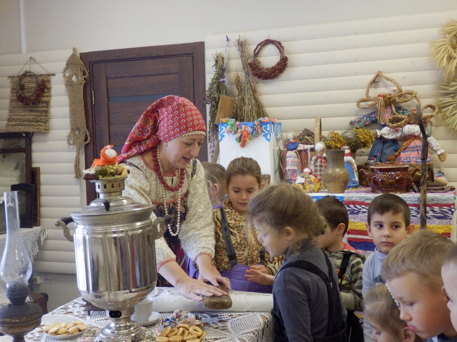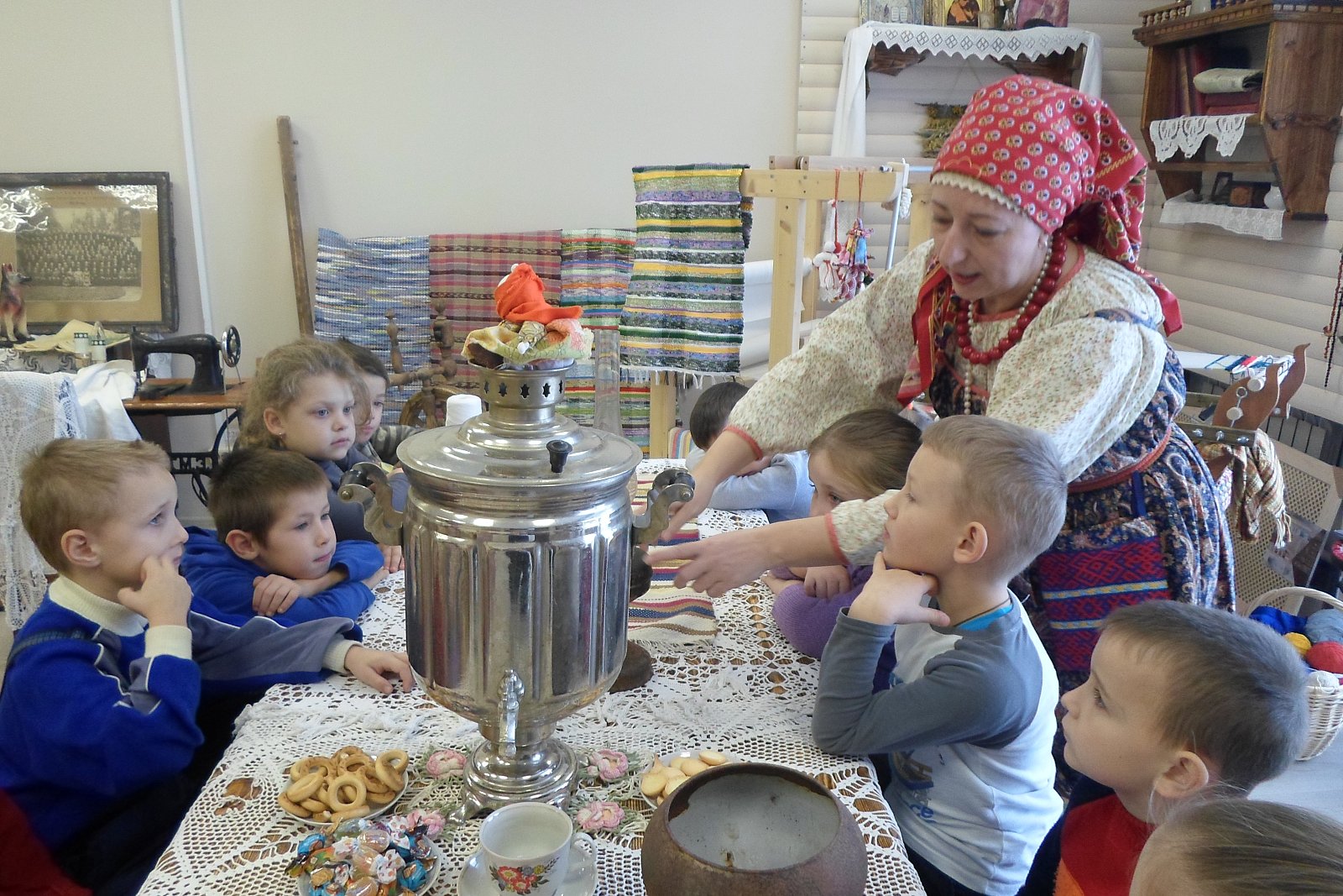 29 ноября воспитанники старшей - подготовительной группы МБДОУ «Светлячок» совершили экскурсию в Дом культуры в краеведческий музей. работник Дома Культуры, Истратова Наталья Викторовна, в русском национальном костюме радушно встретила ребят и провела очень интересную и познавательную экскурсию по залу музея с разными экспозициями, которые помогли понять и увидеть быт наших предков. В «русской избе» дошкольники познакомились с предметы связанные с печью: кочергой, старинной посудой. Узнали о том, что коромысло изготавливали из липы, осины, ивы – древесина, которых отличается легкостью, гибкостью, упругостью, увидели старинные часы, посуду. Девочек заинтересовали утюги, ткацкий станок, коромысло. А мальчиков - старинные инструменты, подковы, серпы. В музеях экспонаты трогать нельзя, а нашем Черкутинском краеведческом музее ребята не только потрогали, но попробовали их в деле: ухватом поставили чугунки в печку, прошлись с коромыслом, подержали утюги, разглядели прялку, увидели, как Наталья Викторовна работает на ткацком станке. Старое уходит, но его нужно знать и беречь. Русская старина вся пронизана добром, а это очень важно в наши дни, и особенно актуально для детей дошкольного возраста. Приобщая детей к истокам Русской народной культуры, мы развиваем личность ребёнка. Народная мудрость гласит: «Не забывайте старь – она новизну держит».