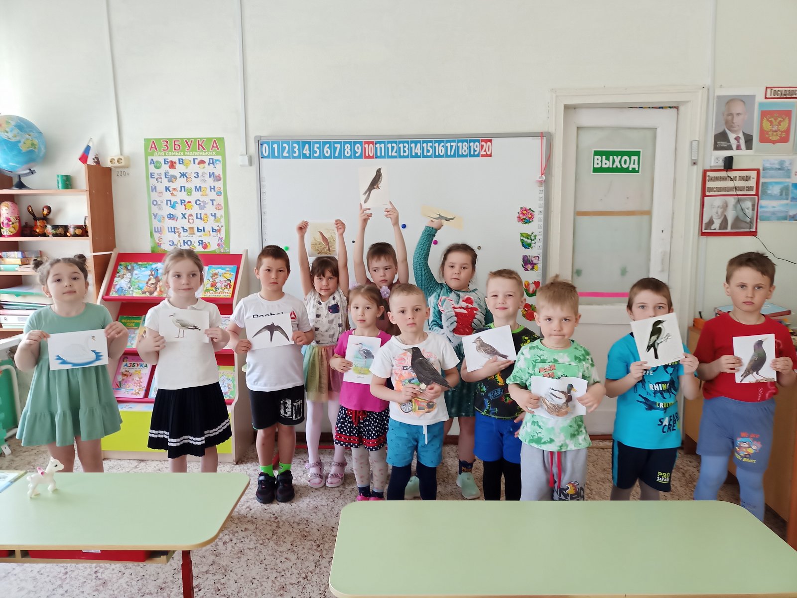 В этот день ребята старшей группы «Смешарики» узнали много интересного: какие пернатые друзья живут рядом с нами круглый год, а какие возвращаются весной из теплых краев, о пользе птиц, их роли в природе и в жизни человека. Дети отгадывали загадки, слушали пение птиц, из детской энциклопедии узнали о рекордсменах царства пернатых. Интересно и познавательно прошла игра - викторина «Что за птица? Угадай!»