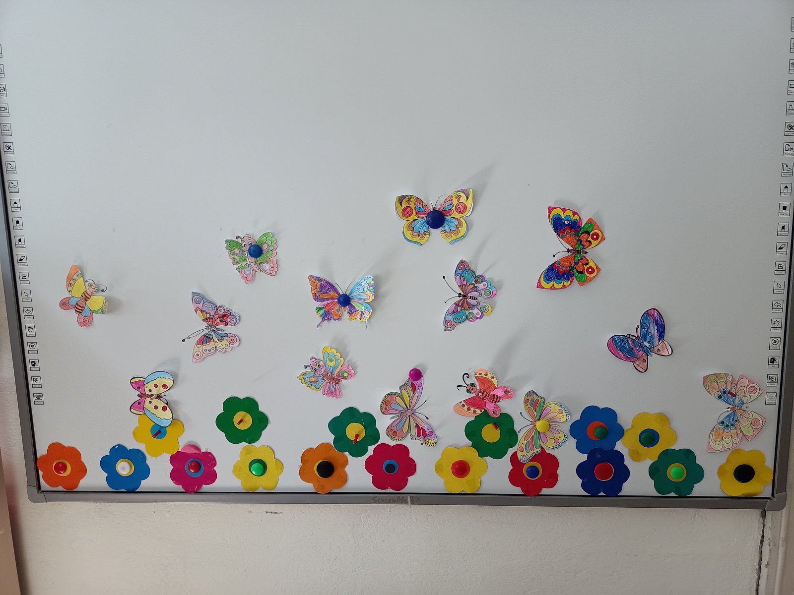Сегодня ребята узнали много нового и интересного о бабочках, их многообразии, строении и образе жизни, поговорили с ребятами и о том, что бабочек надо беречь . С удовольствием рассматривали яркие иллюстрации в детской энциклопедии «Бабочки». Поиграли в такие игры как: «Собери для бабочки цветок», «С цветка на цветок перелетим и цветок мы опылим». Не обошлось и без художественного творчества. Дети раскрашивали бабочек. Благодаря своей фантазии, каждый из ребят сотворил свою неповторимую бабочку. А в конце творческой работы, под веселую музыку дошколята прикрепили бабочек на цветочную полянку. Получилось просто великолепно! На прогулке дети наблюдали за бабочками, слушали сказки «Откуда у бабочки красивые крылышки?», «Бабочка и цветок».