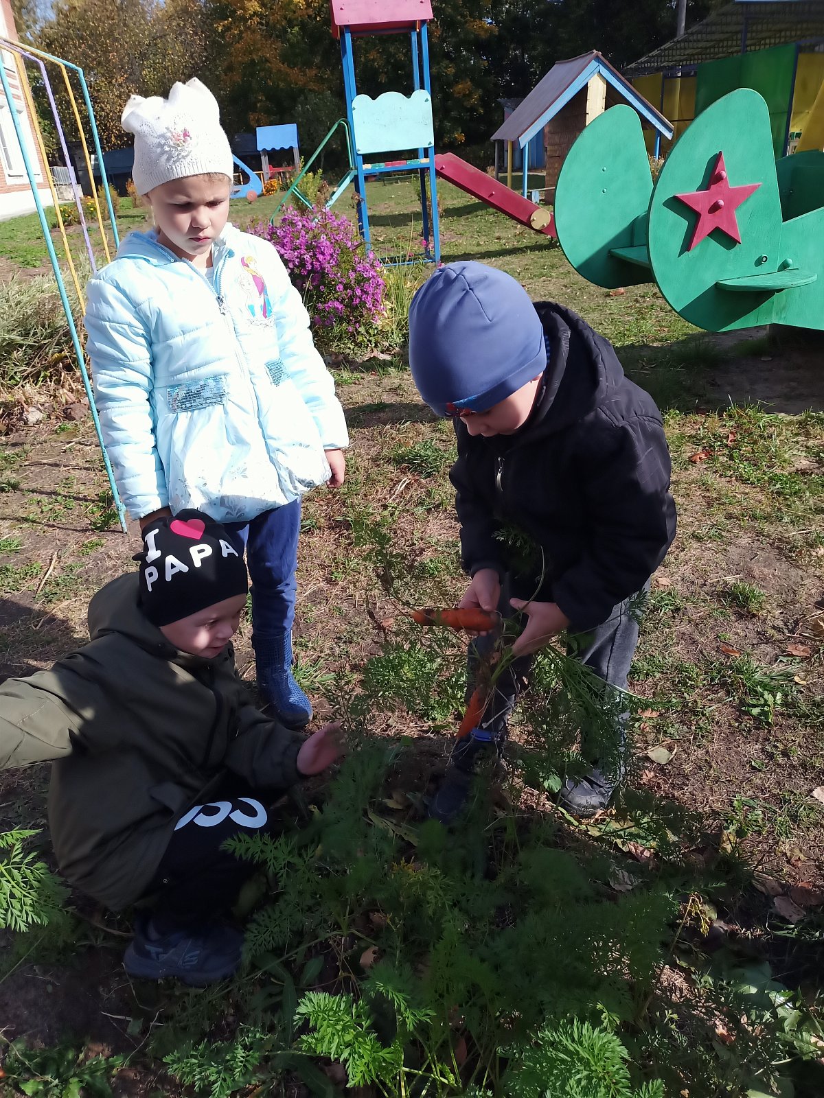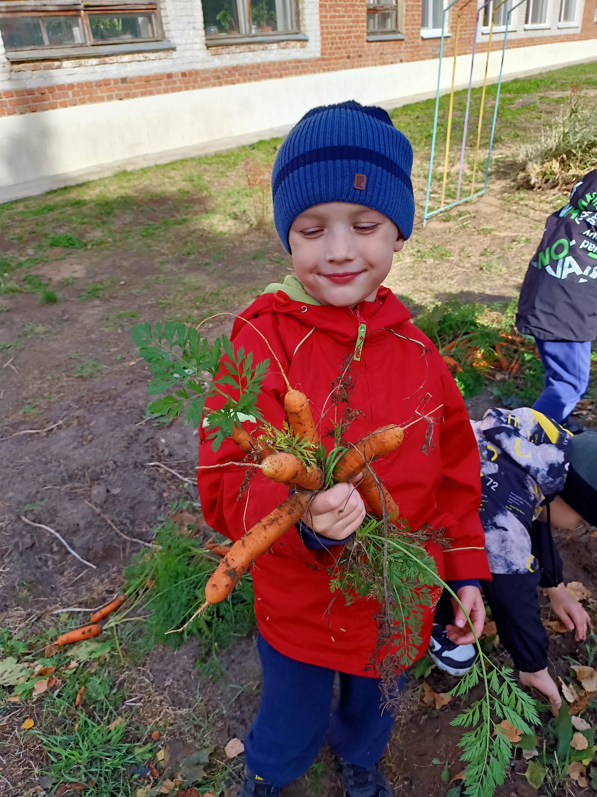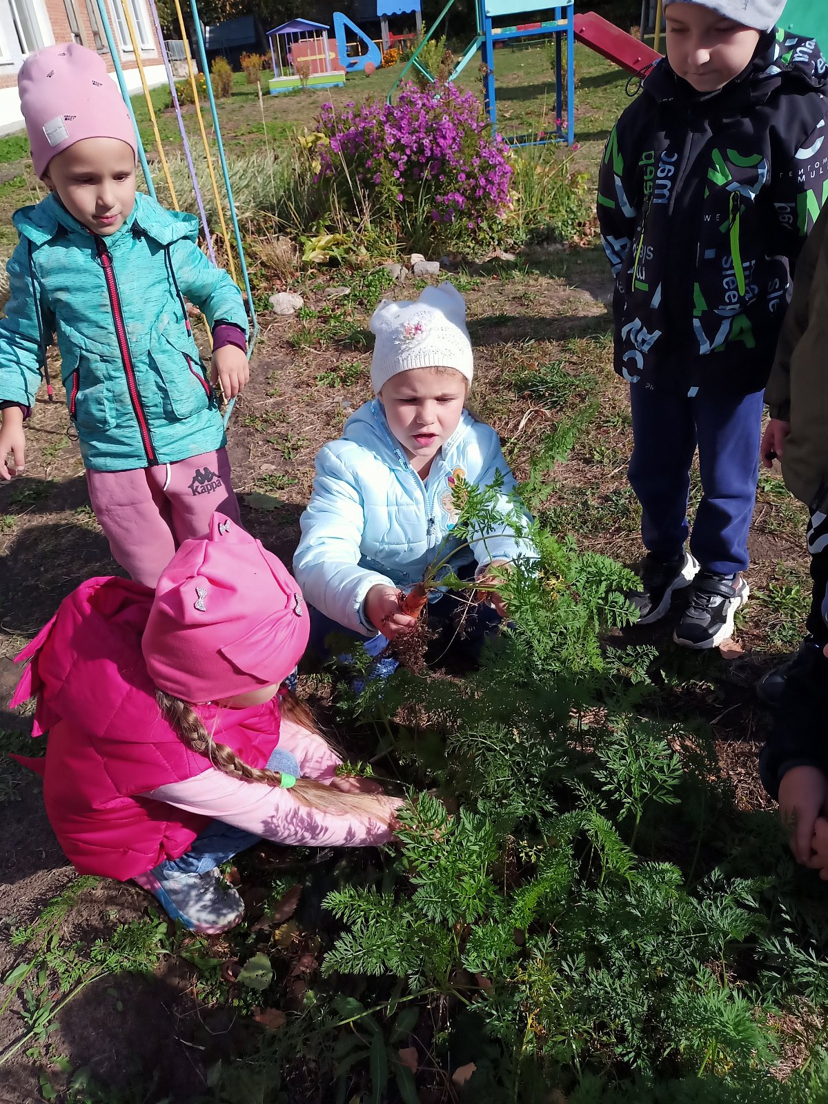 Огород в детском саду - это еще и возможность видеть результаты своей работы. Совместный труд взрослого и ребенка на огороде дает возможность научиться самостоятельности, способствует формированию трудовых навыков и объединению детского коллектива. И конечно, огород - это труд на свежем воздухе, который способствует сохранению и укреплению здоровья детей, гармоничному развитию. Сегодня ребята собрали неплохой урожай моркови, который вызвал у дошкольников огромную радость, чувство гордости за свой труд. Они сначала с интересом рассмотрели её, а потом взяли с собой в группу и попробовали на вкус. Морковка казалась очень сладкая!.