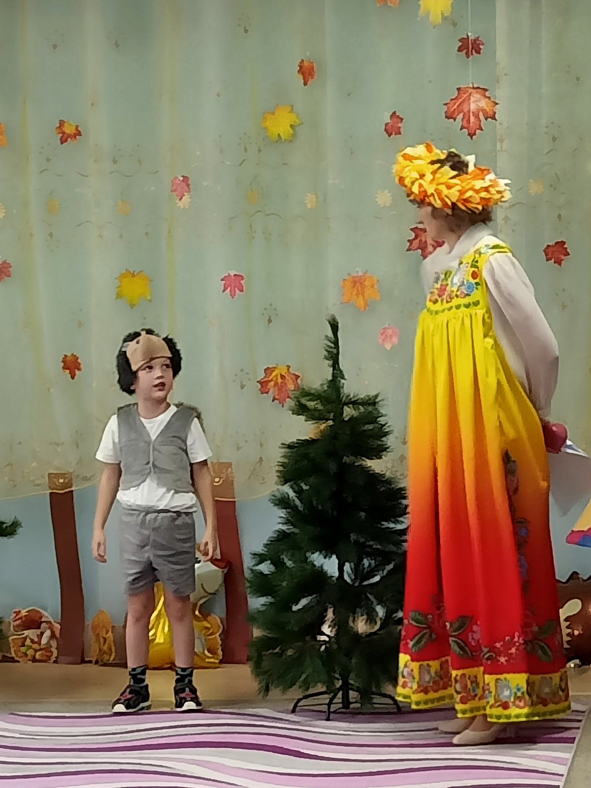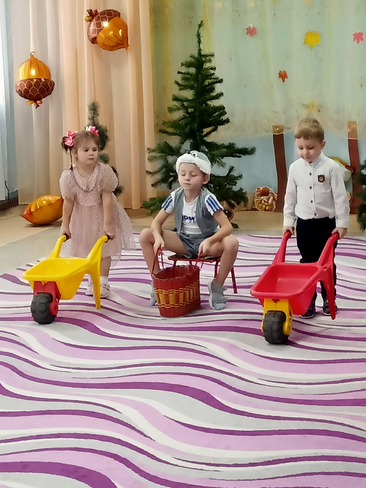 Вместе с хозяйкой праздника малыши отправились на паровозе в осенний лес. там они встретили Зайчика и Ежика. Ребята помогли зверятам заготовить овощи на зиму и собрать грибочки. В заключение праздника Осень угостила всех вкусными яблоками.