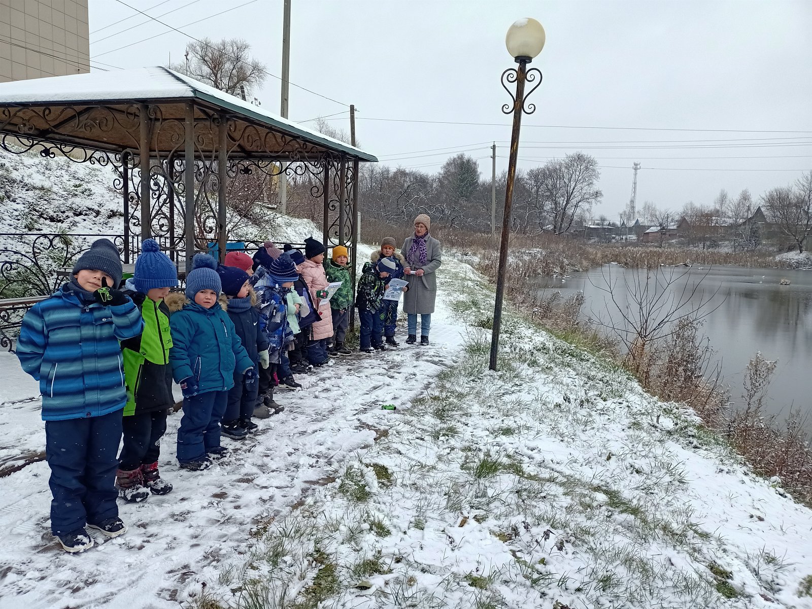 - проведена целевая экскурсия на пруд, с целью формирования представлений о возможных опасностях на водных объектах в зимний период. Ребята обратили внимание, что берега покрыты снегом, а вода замерзла, и вспомнили, какие опасности таит в себе этот лед;