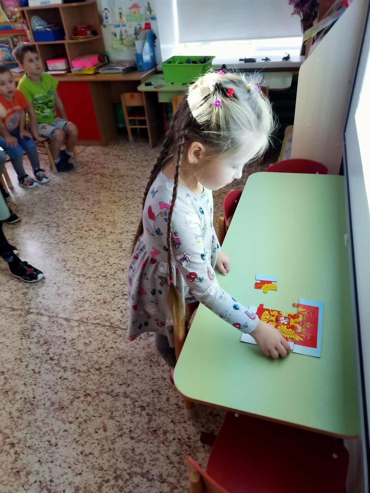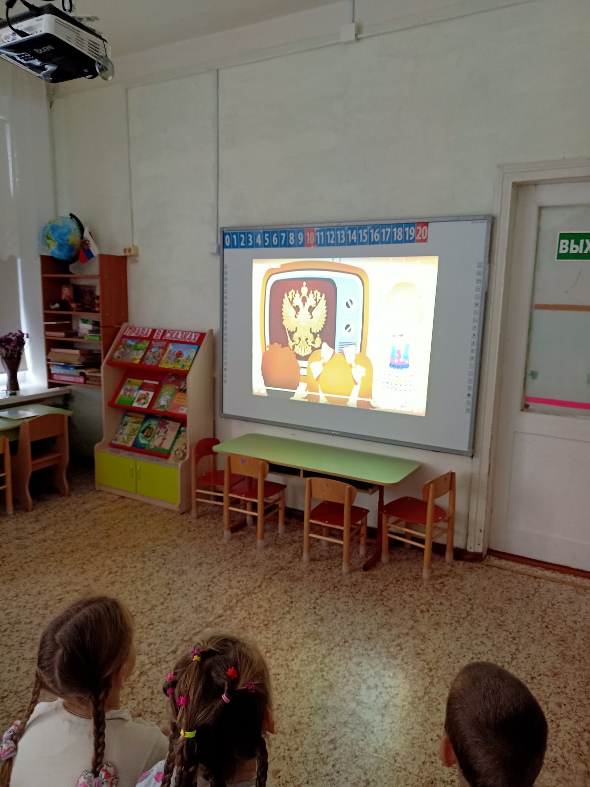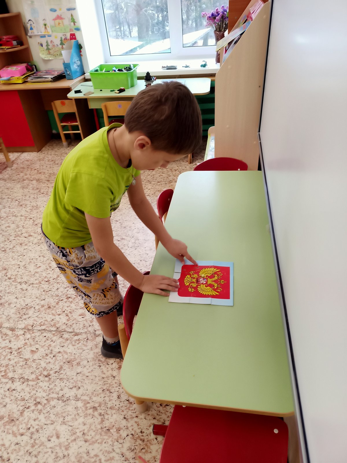 Накануне праздника в старшей группе «Смешарики" прошёл тематический час «День Государственного герба Российской Федерации», в ходе которого дети узнали об истории возникновения герба России, о его значении и рассмотрели все детали изображения: двуглавого орла, скипетр, державу и другие элементы. Ребята рассматривали предметы, где изображен герб России, играли в дидактические игры «Найди флаг России», «Найди герб России», смотрели презентацию. В заключении провели квест – игру «Герб России»