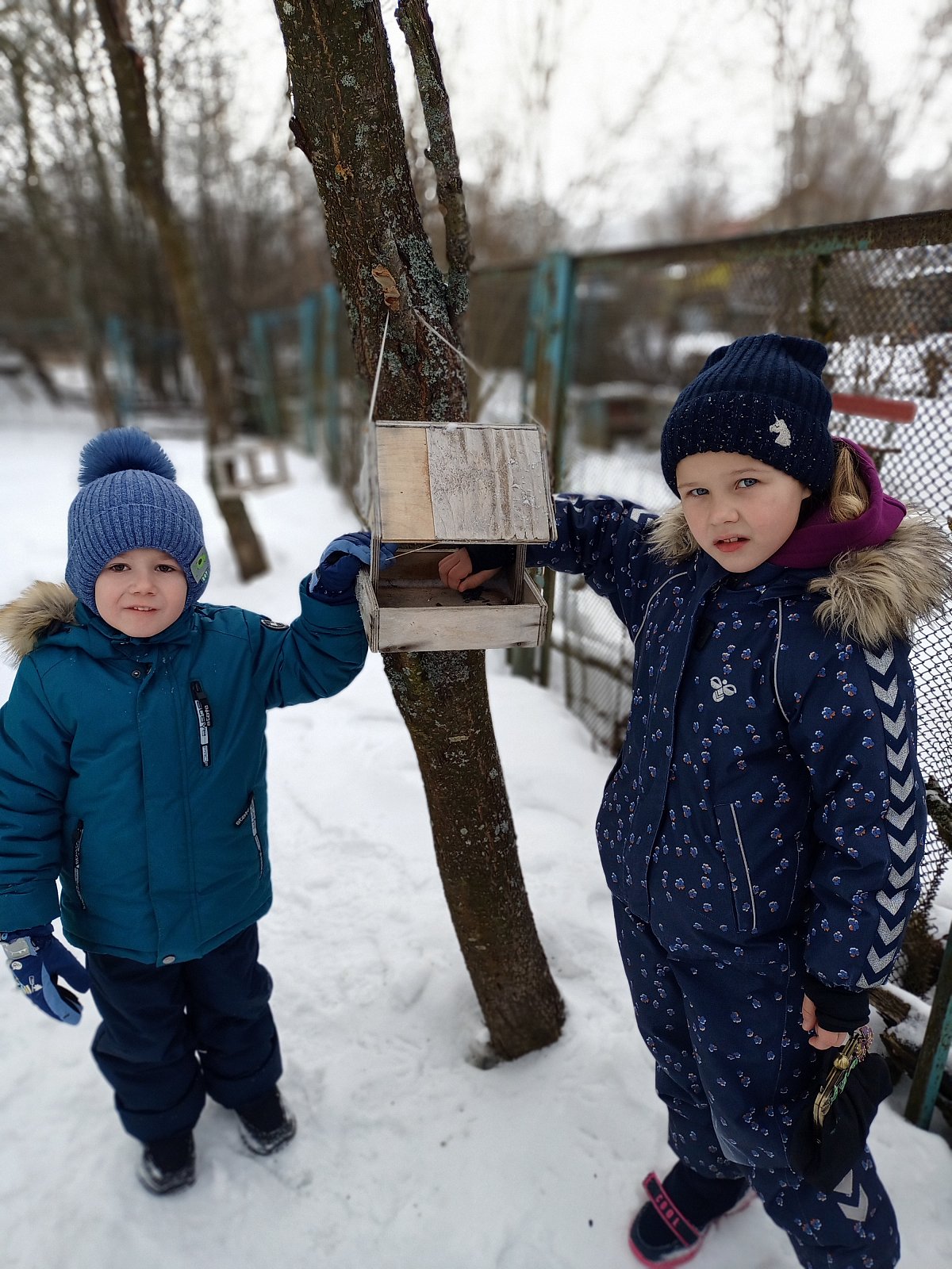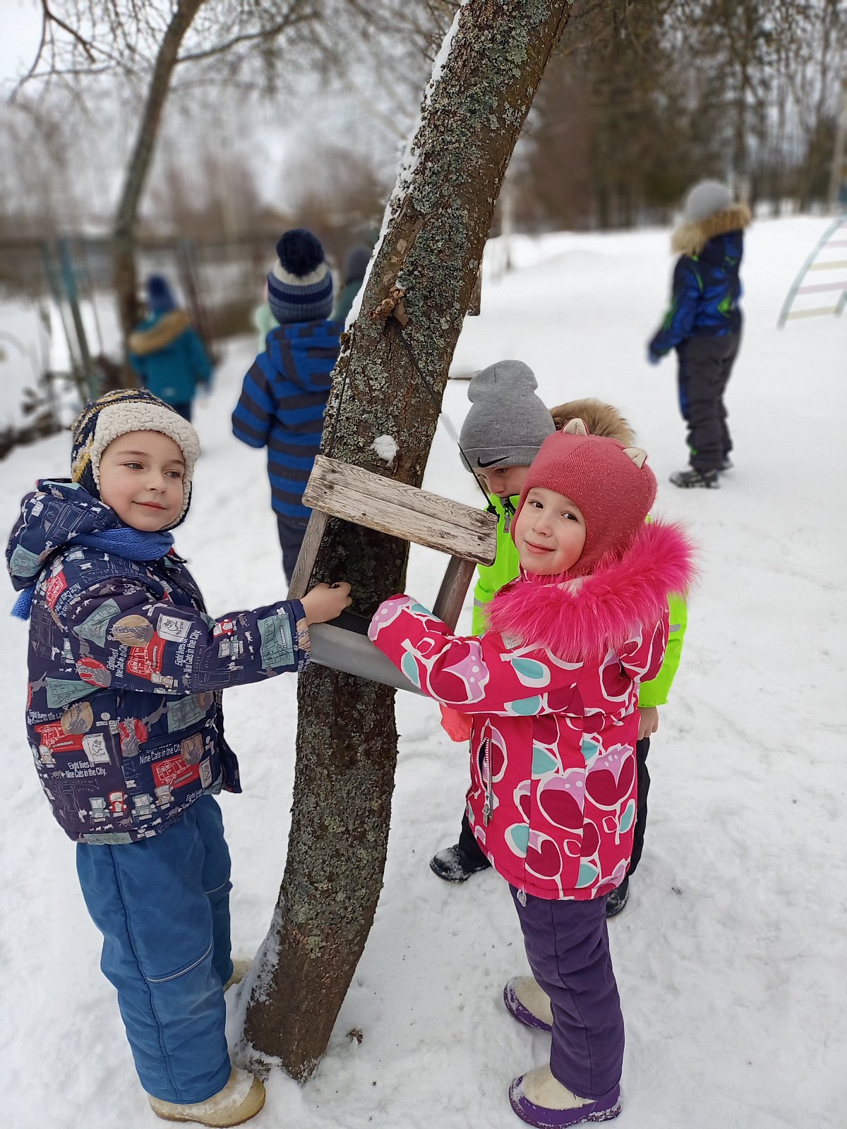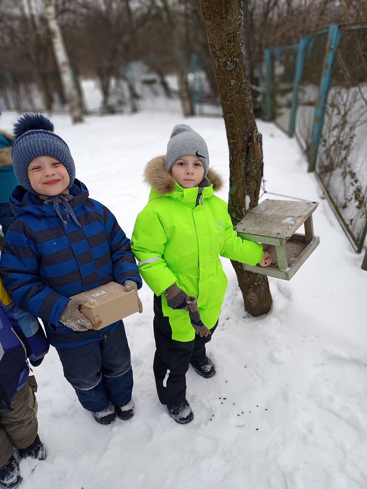. Во время прогулки дошкольники угостили птиц, наполнив кормушки кормом.