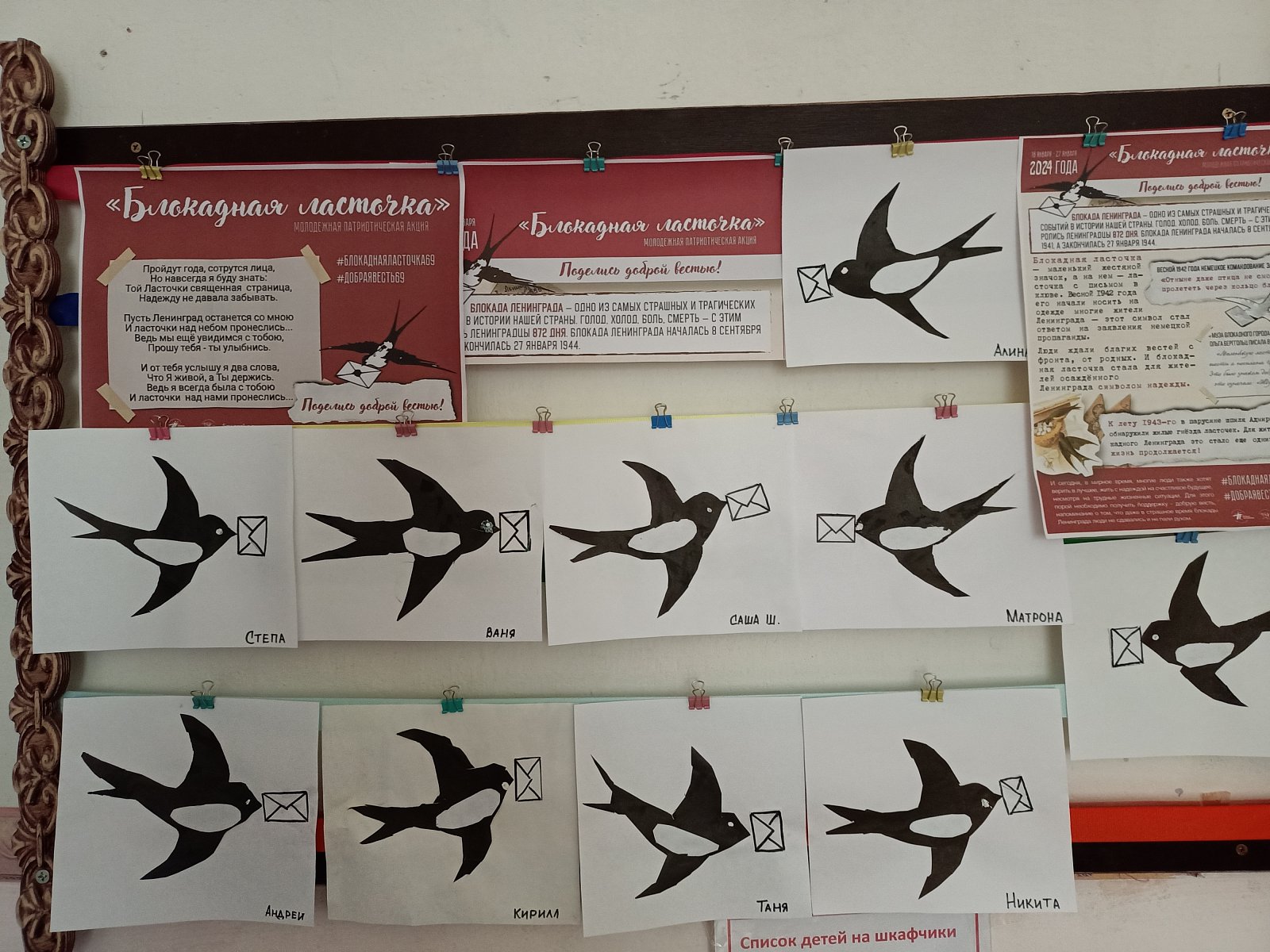 Воспитанники старшей группы «Смешарики» присоединились к патриотической акции "Блокадная ласточка". Ребята узнали историю доброй вестницы надежды и при помощи аппликации изготовили символ стойкости и веры блокадного Ленинграда.