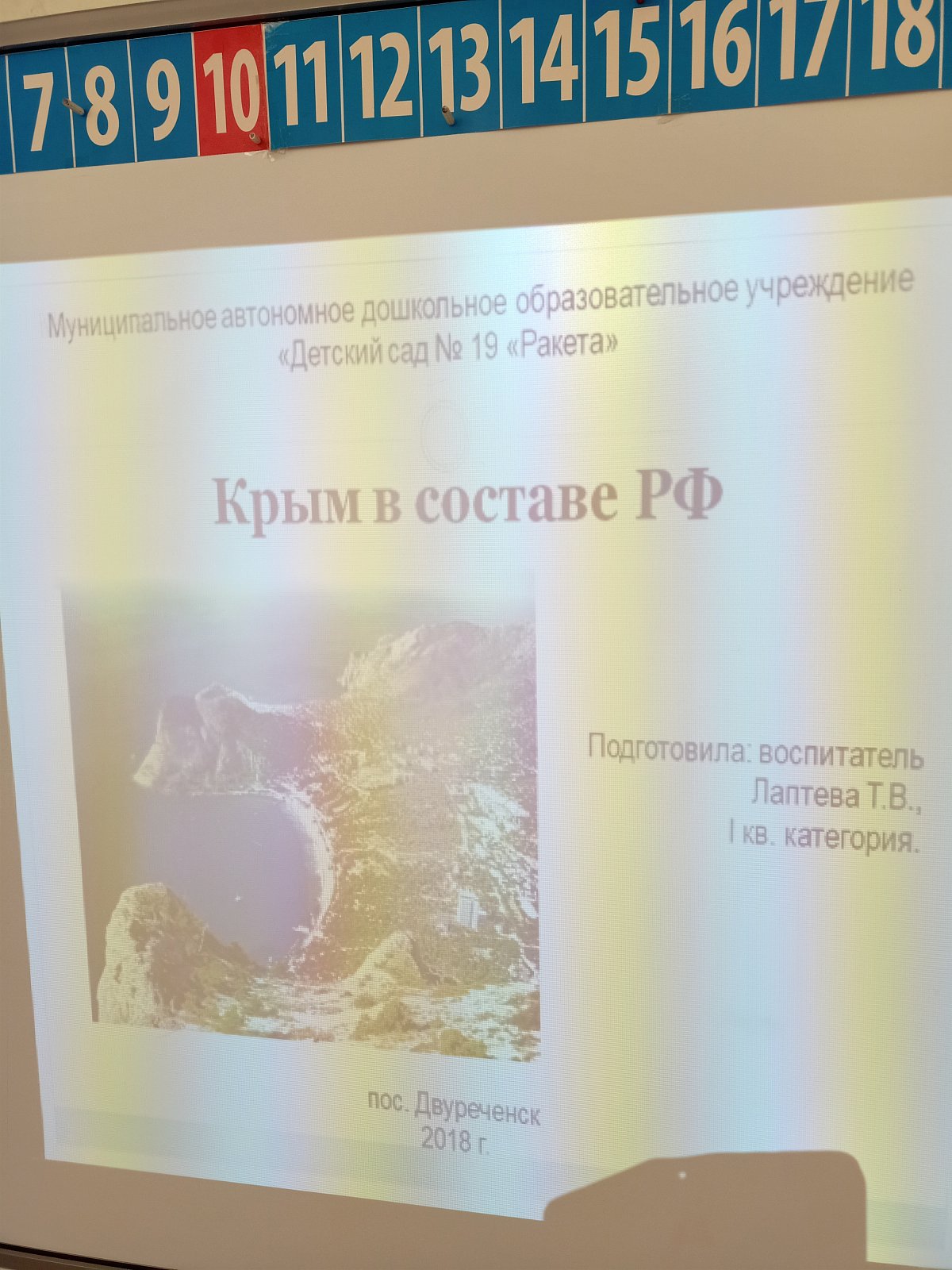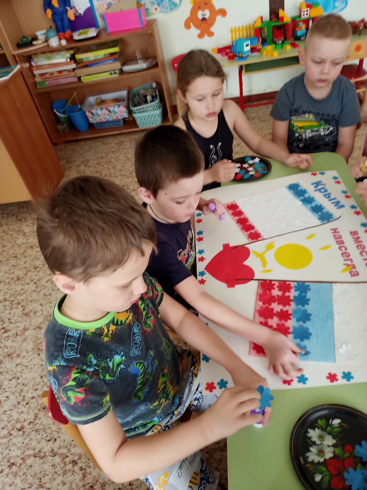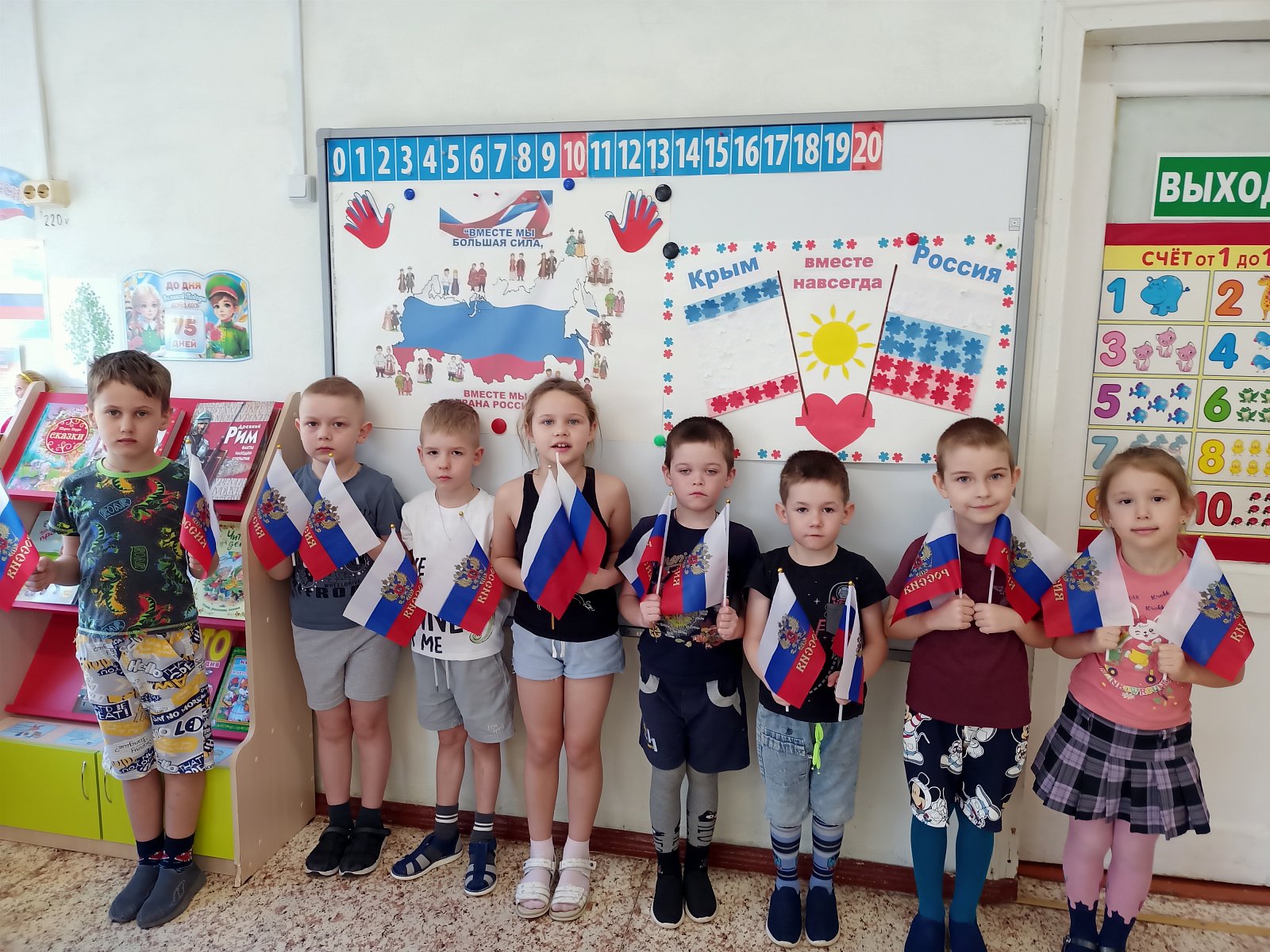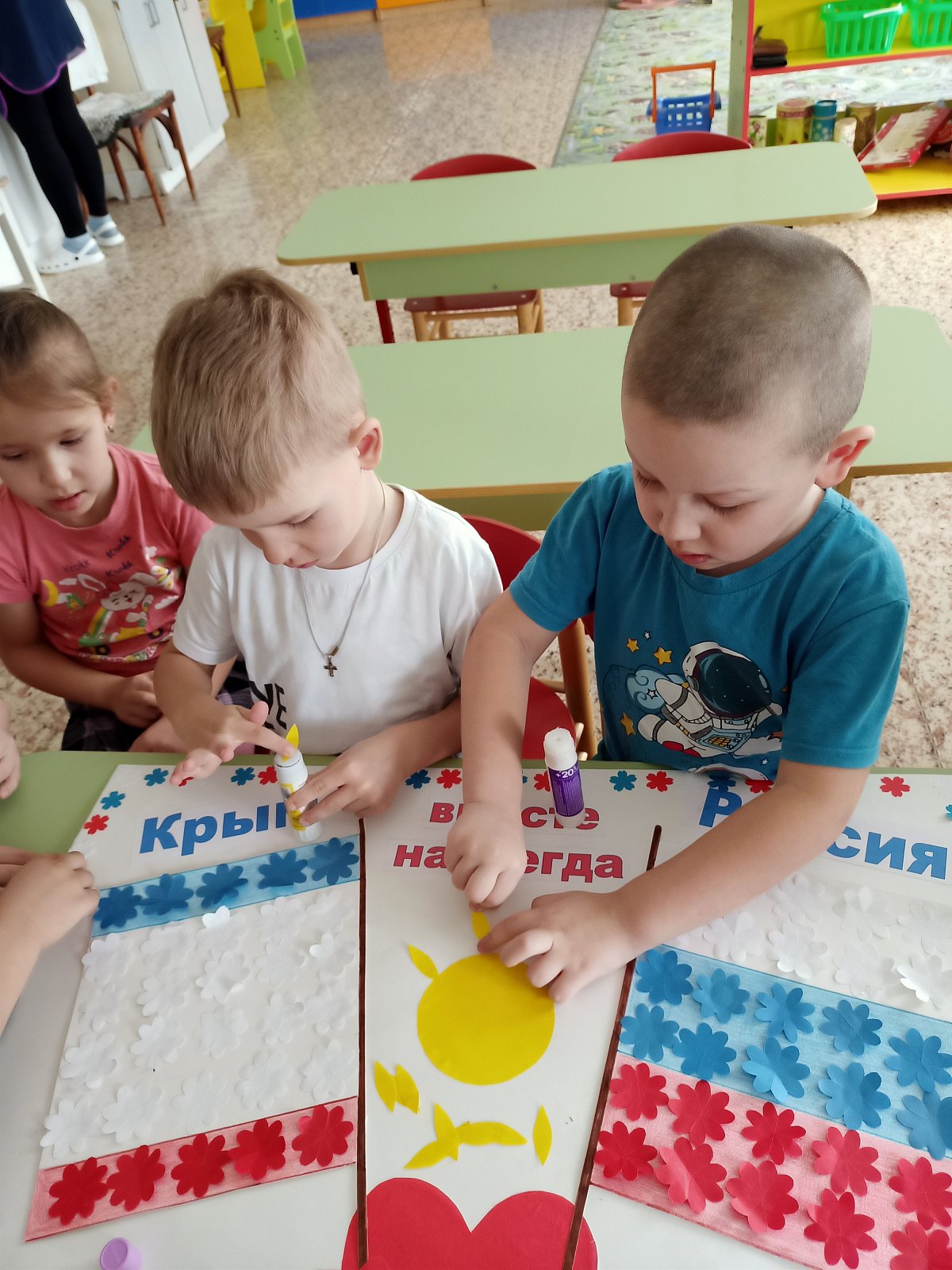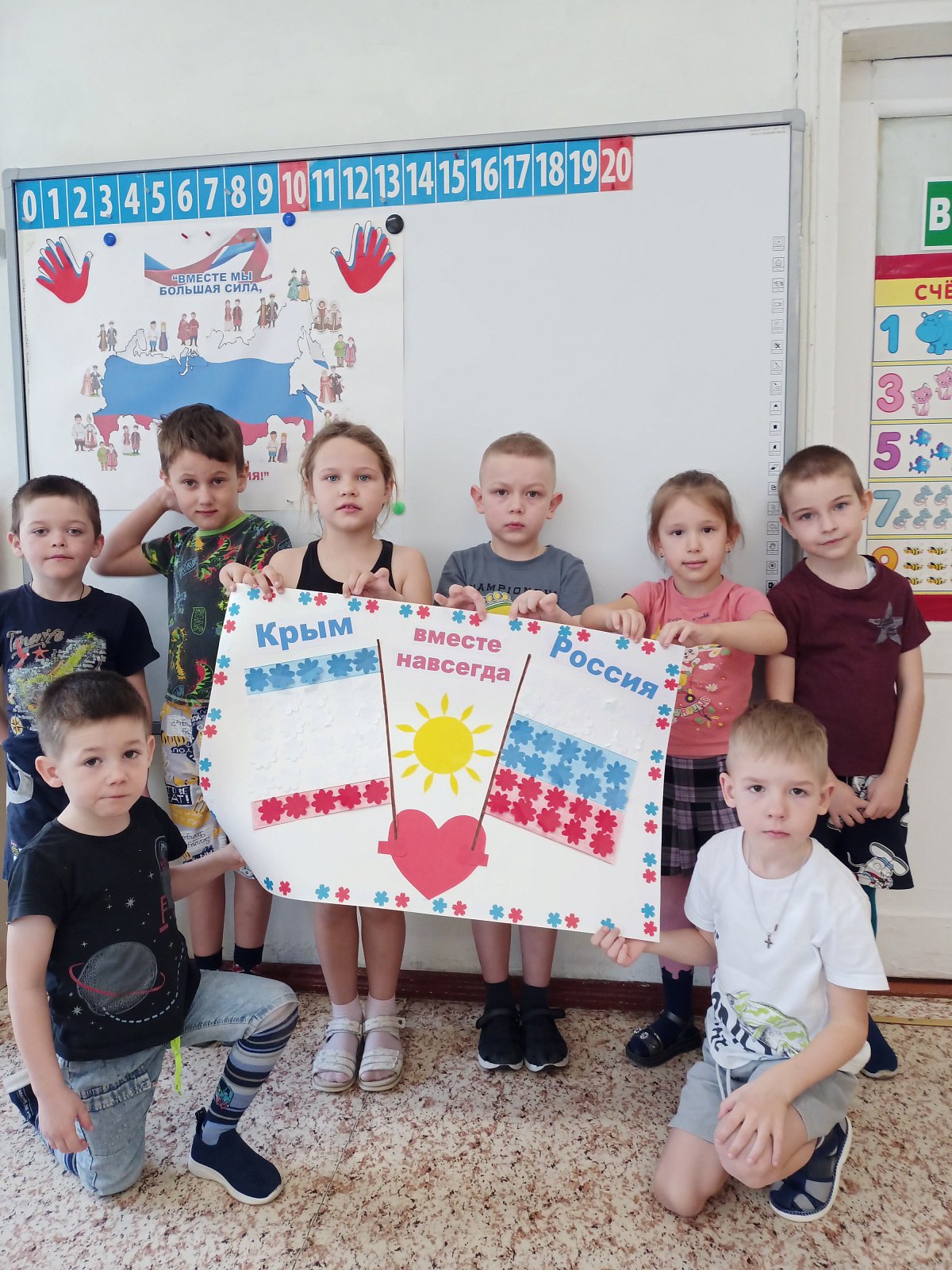 18 марта в нашей стране отмечается важная дата - День воссоединения Крыма с Россией. Этот день стал праздником для крымчан и всего народа России, а Крымская весна - символом единства и сплоченности нации, исторической вехой для нашей страны. С целью формирования у детей патриотических чувств, уважения к истории своей страны, развития интереса к историческим событиям, произошедшим в Крыму 18 марта 2014 года, в старшей группе “Смешарики” прошел тематический день, посвященный Дню воссоединения Крыма с Россией. Ребята с интересом слушали рассказ воспитателя об истории Крыма, о достопримечательностях и природе полуострова, узнали о значении полуострова для нашей страны, рассмотрели карту, месторасположение полуострова; символику края. Дошкольники получили много интересной и полезной информации об уникальном и неповторимом уголке планеты Земля - полуострове Крым. Этот день подарил детям хорошее весеннее настроение и яркие впечатления! Дошкольники с интересом посмотрели презентацию "Россия и Крым. Мы вместе", сделали тематическую аппликацию «Вместе навсегда»