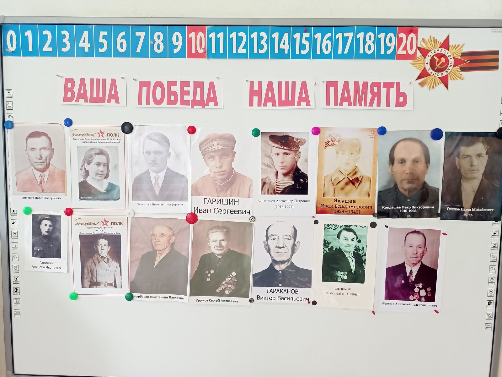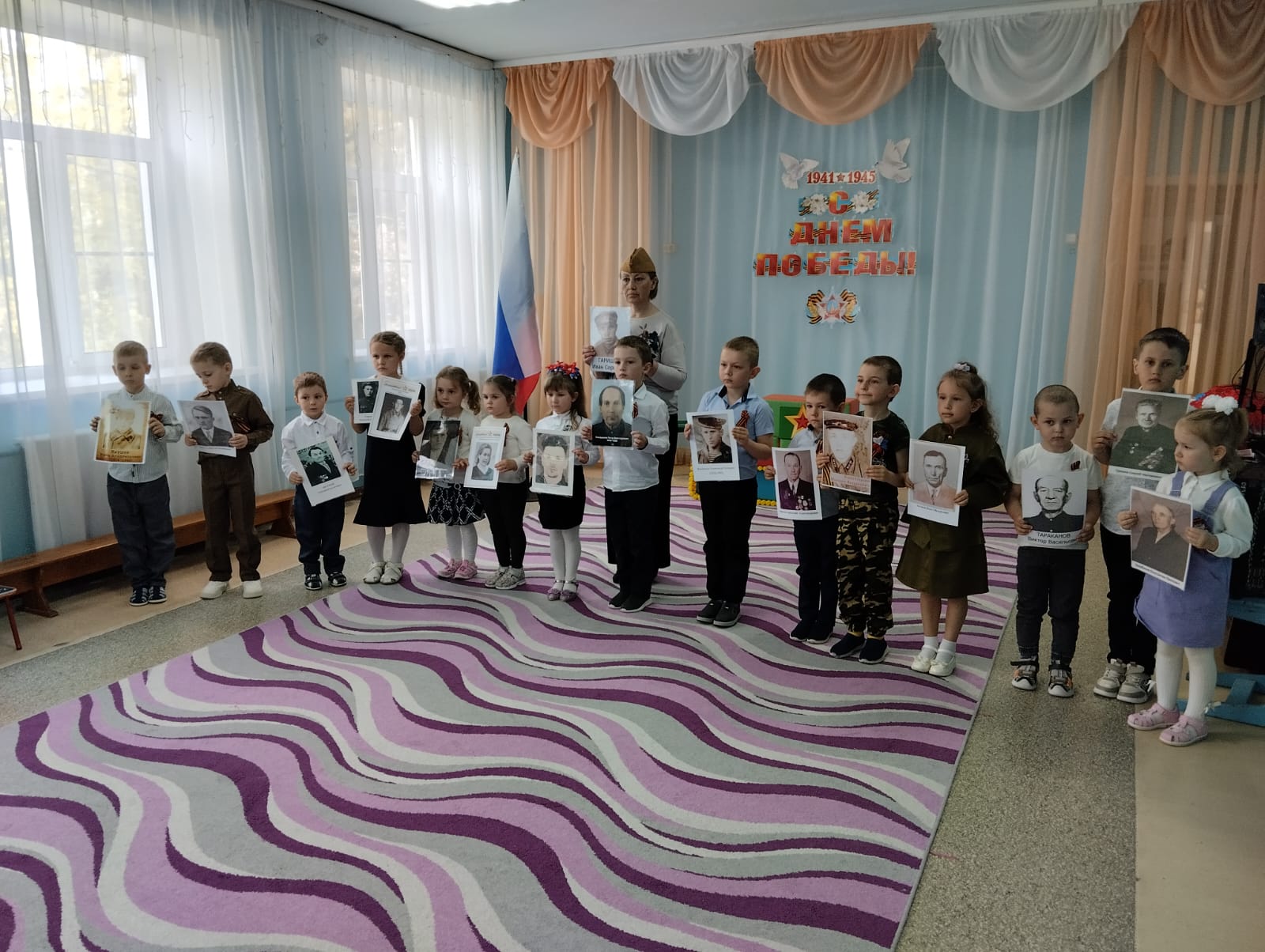 Воспитанники старшей группы «Смешарики» совместно с родителями подготовили портреты своих родных – участников ВОВ, ведь в каждой семье есть своя военная история. Своя родовая память. И как важно для всех нас, чтобы наши дети и дети наших детей помнили о Великой войне, о великом подвиге советского народа. Под песни военных лет ребята гордо пронесли портреты своих прадедов.