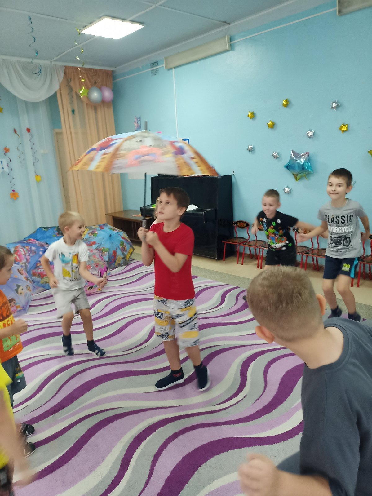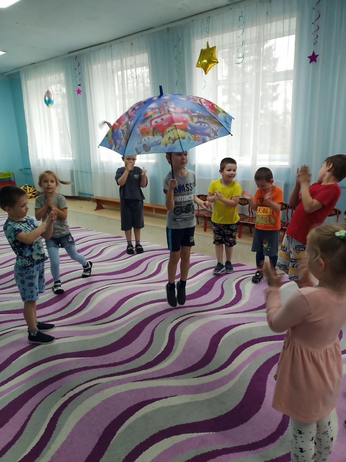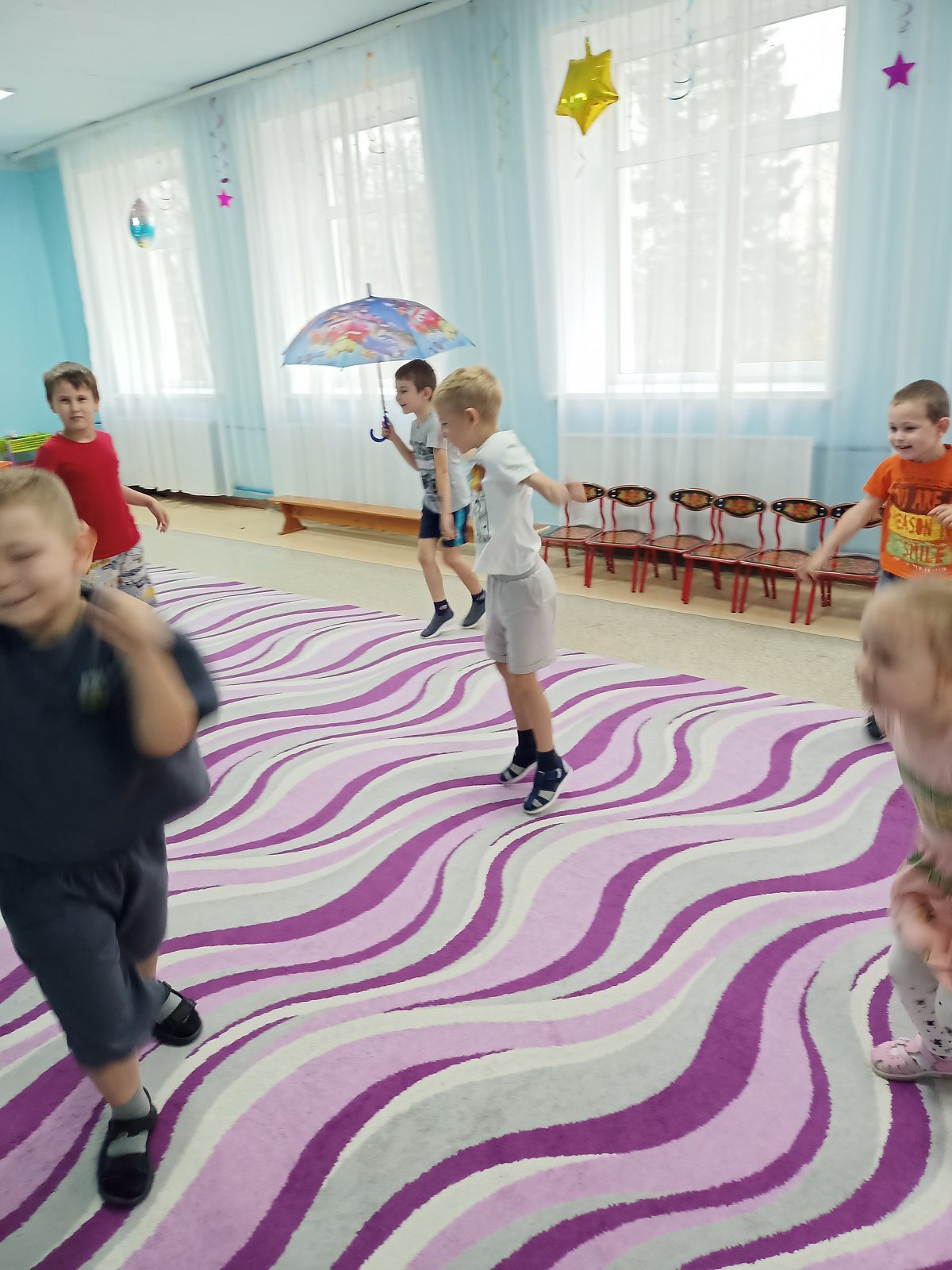 Дети старшей группы «Смешарики» совершили путешествие в историю происхождения зонтика. Ребята узнали, что первый зонтик появился в Китае, что он был предназначен для защиты от солнца, познакомились с многообразием зонтов, их строением. Они увидели, что зонты бывают с чехлом, надувные зонты, зонт – облако, зонт на двоих, зонт для собаки! Как же это здорово! Танцевать, кружить и веселиться под розовыми, красными, синими зонтиками. Дети с удовольствием играли в игры «Мой зонтик», «Пробеги с зонтиком через лужи», «Волшебный зонт»… «Собери яблоки в зонтик»