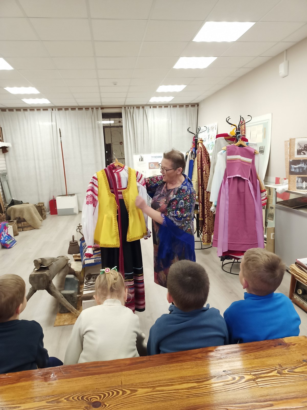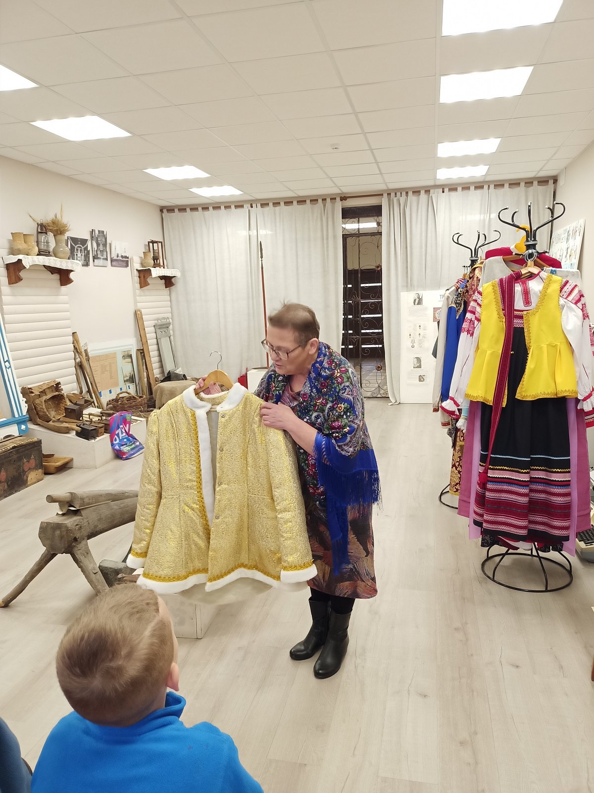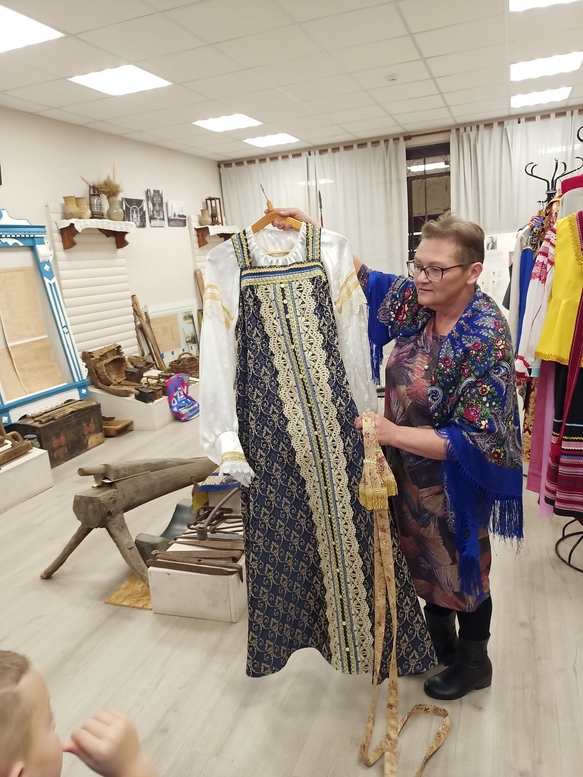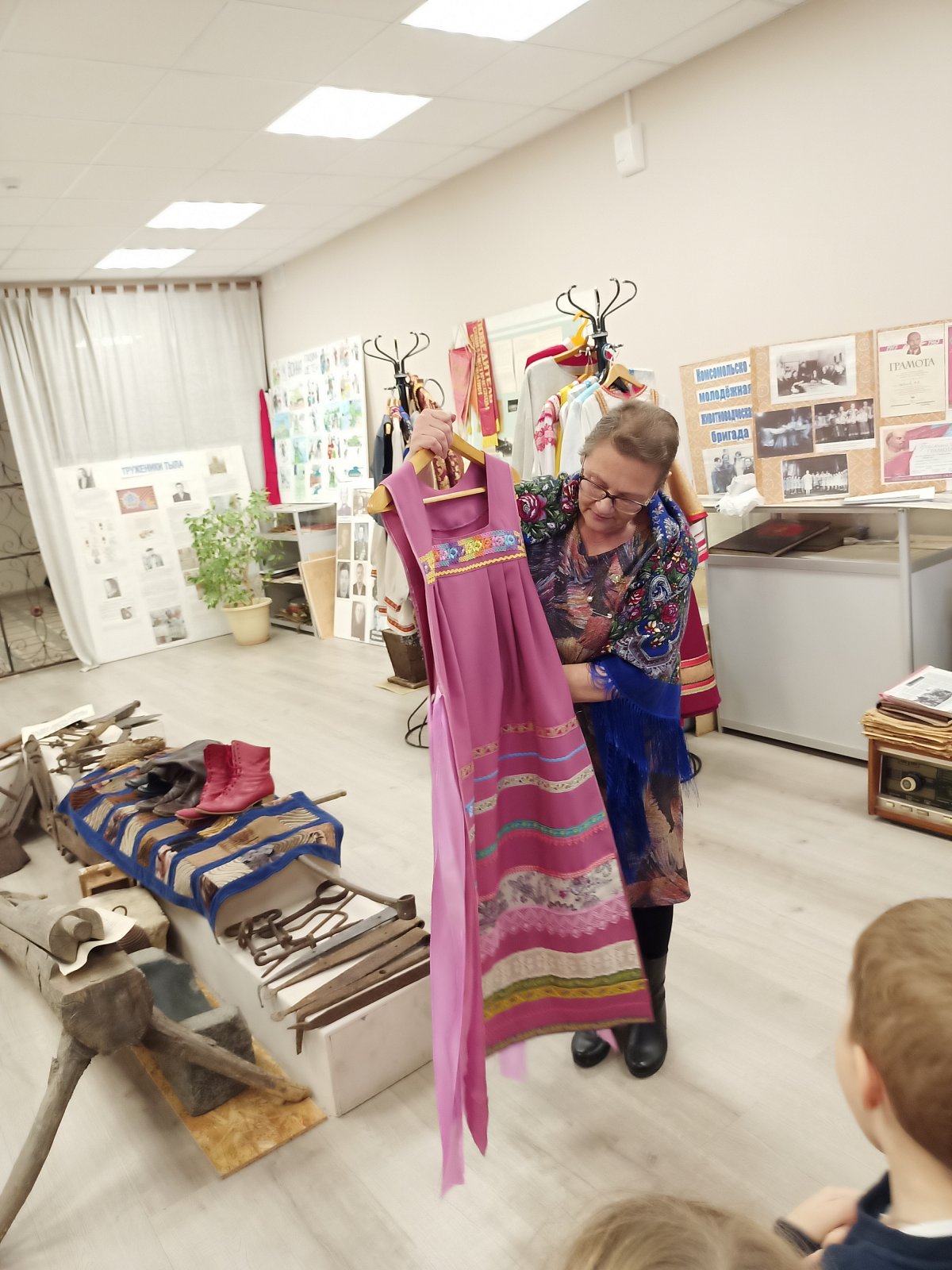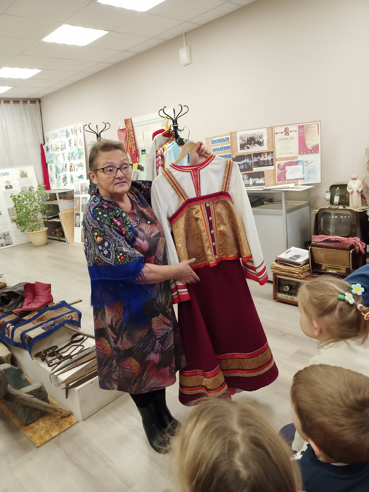Интересное занятие по приобщению к истокам русской народной культуры провела для воспитанников старшей «Смешарики» работник краеведческого музея Дома Культуры Пашина Елена Вячеславовна. Ребята познакомились с русскими народными костюмами. его особенностями, обратили внимание на то, что русский национальный костюм - это труд, мастерство русских женщин. Это не просто одежда, а большая история, которая может поведать о целом народе. В течение занятия дети с большим интересом рассматривали национальные костюмы, даже померили головные уборы. В ходе мероприятия ребята не только обогатили свои знания об истории народного костюма, но также узнали о назначении отдельных его частей. Русская народная одежда различалась по назначению (будничная, праздничная, обрядовая), по ней можно было судить о возрасте, семейном положении. Как правило, при этом менялся не покрой и вид одежды, а ее цветность, количество декора (вышитых и вытканных узоров).