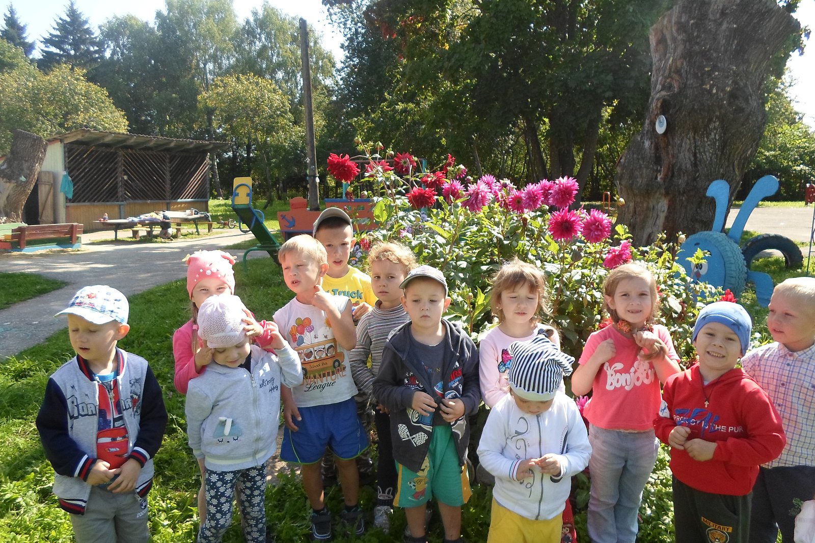 Сегодня, 15 августа воспитанники старшей группы «Смешарики» рассматривали, сравнивали цветущие растения от не цветущих, восхищались красотой растений, радовались цветам, познакомились с названием цветов, с особенностями их строения: стебель, листья, цветок, так же учились выделять общие и различные признаки между растениями: трава и цветы ниже, чем деревья.