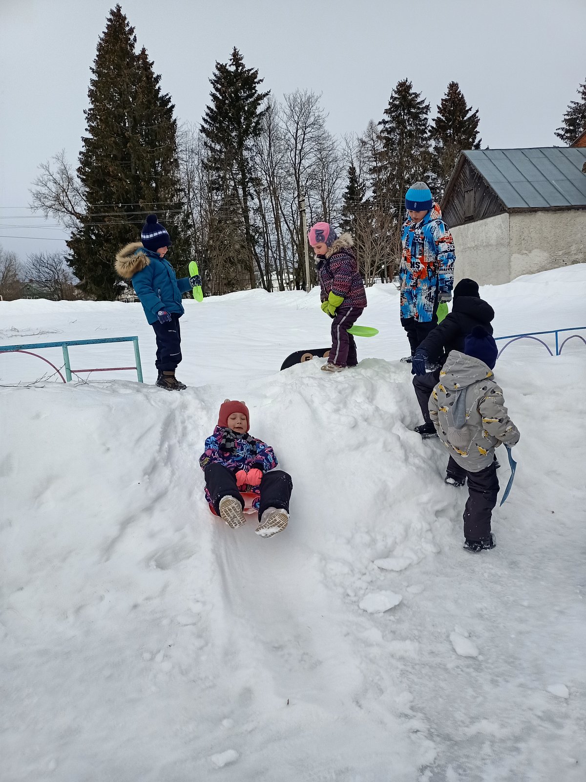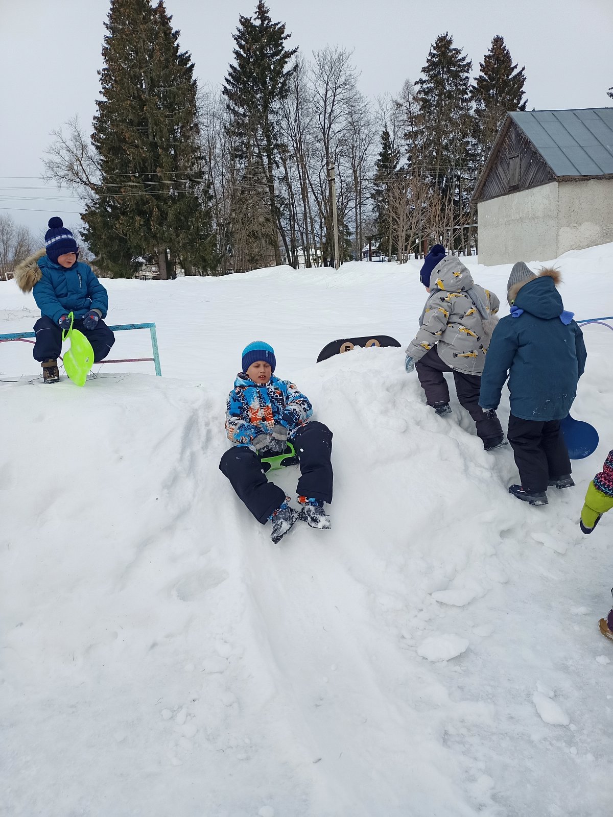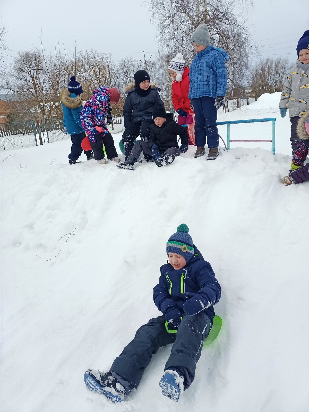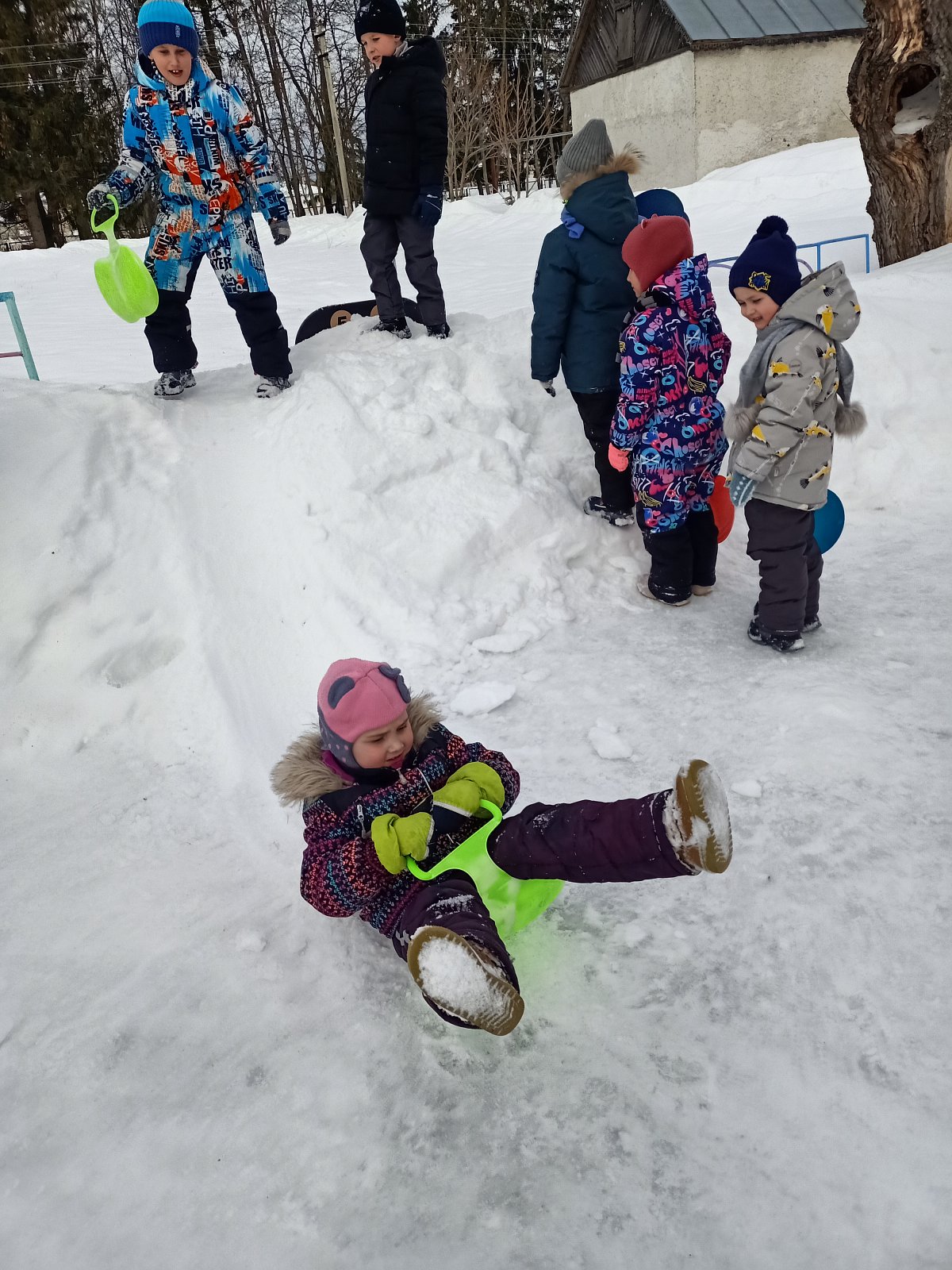 Зима закончилась, но зимние забавы для детей продолжаются. На участке детского сада еще настоящее царство зимы. Сегодня ребята старшей группы «Смешарики» на прогулке с удовольствием катались на ледянках со снежной горки.